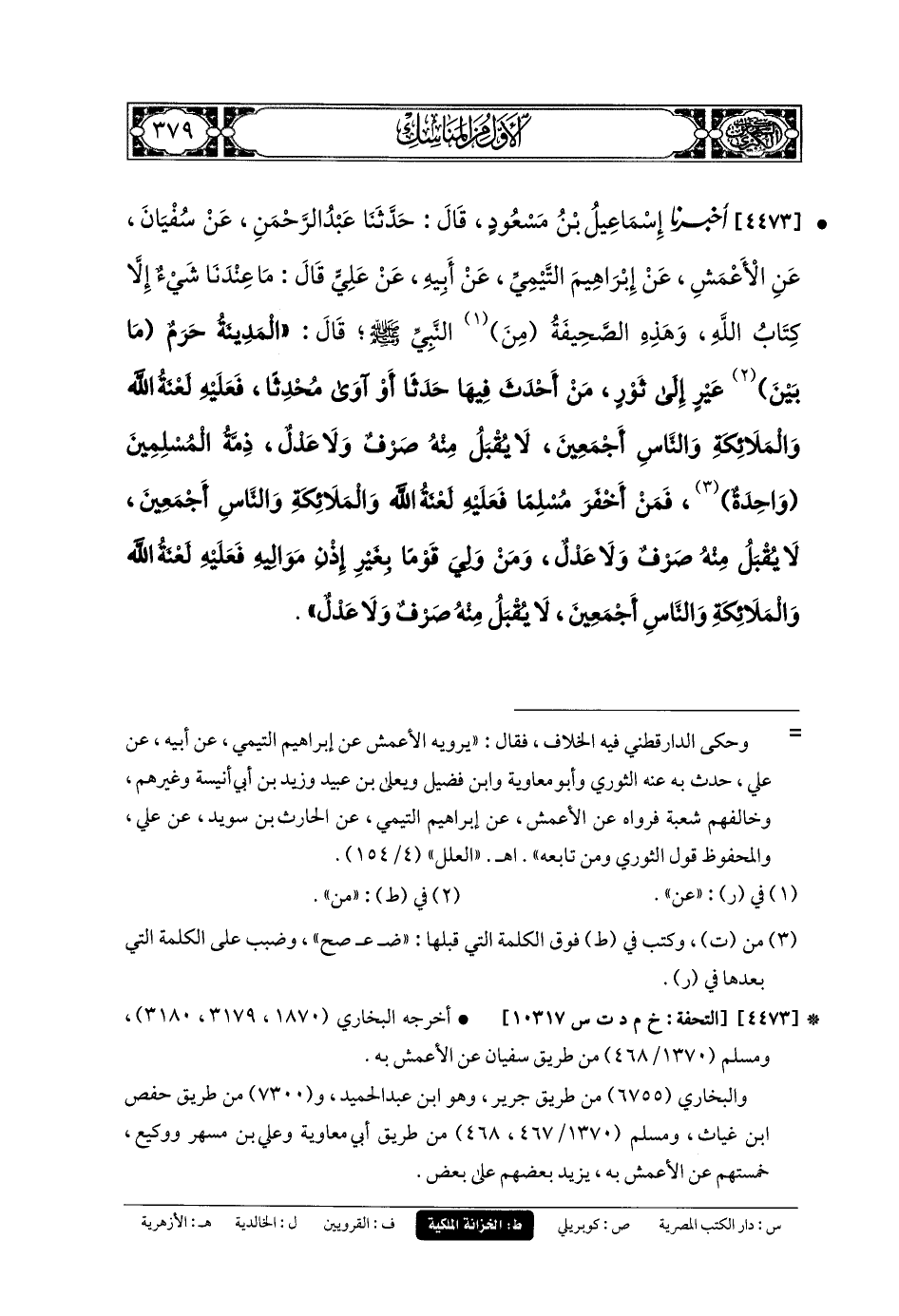 4473 - أَخبَرنا إِسمَاعِيلُ بنُ مَسْعُودٍ، قَالَ: حَدَّثنا عَبدُ الرَّحمَنِ، عَن سُفيانَ، عَنِ الأَعْمَشِ، عَن إِبرَاهِيمَ التَّيْمِيِّ، عَن أَبيهِ، عَن عَليٍّ، قَالَ: مَا عِنْدَنَا شَيْءٌ إِلاَّ كِتَابُ اللهِ، وَهَذِهِ الصَّحِيفَةُ مِنَ النَّبيِّ صَلى الله عَليه وسَلم قَالَ: المَدِينَةُ حَرَمٌ مَا بَيْنَ عَيْرٍ إِلَى ثَوْرٍ، مَنْ أَحْدَثَ فِيهَا حَدَثًا أَوْ آوَى مُحْدِثًا فَعَلَيْهِ لَعْنَةُ اللهِ وَالمَلائِكَةِ وَالنَّاسِ أَجْمَعِينَ، لا يُقْبَلُ مِنْهُ صَرْفٌ وَلا عَدْلٌ، ذِمَّةُ المُسْلِمِينَ وَاحِدَةٌ، فَمَنْ أَخْفَرَ مُسْلِمًا فَعَلَيْهِ لَعْنَةُ اللهِ وَالمَلائِكَةِ وَالنَّاسِ أَجْمَعِينَ، لا يُقْبَلُ مِنْهُ صَرْفٌ وَلا عَدْلٌ، وَمَنْ وَلِيَ قَوْمًا بِغَيْرِ إِذْنِ مَوَالِيهِ فَعَلَيْهِ لَعْنَةُ اللهِ وَالمَلائِكَةِ وَالنَّاسِ أَجْمَعِينَ، لا يُقْبَلُ مِنْهُ صَرْفٌ وَلا عَدْلٌ.