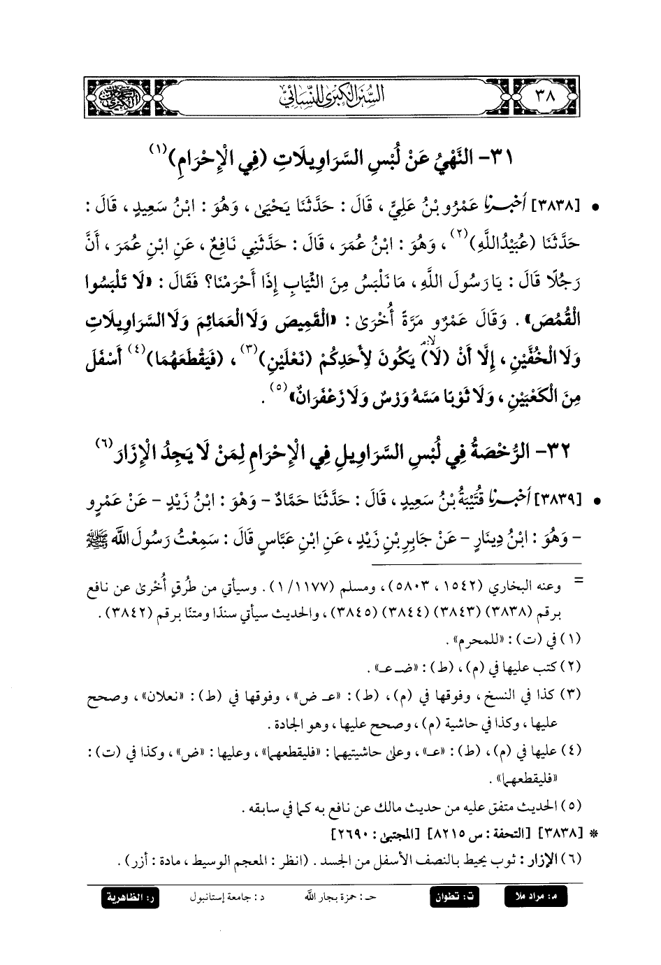 32- الرُّخْصَةُ فِي لُبْسِ السَّرَاوِيلِ فِي الإِحْرَامِ لِمَنْ لا يَجِدُ الإِزَارَ.