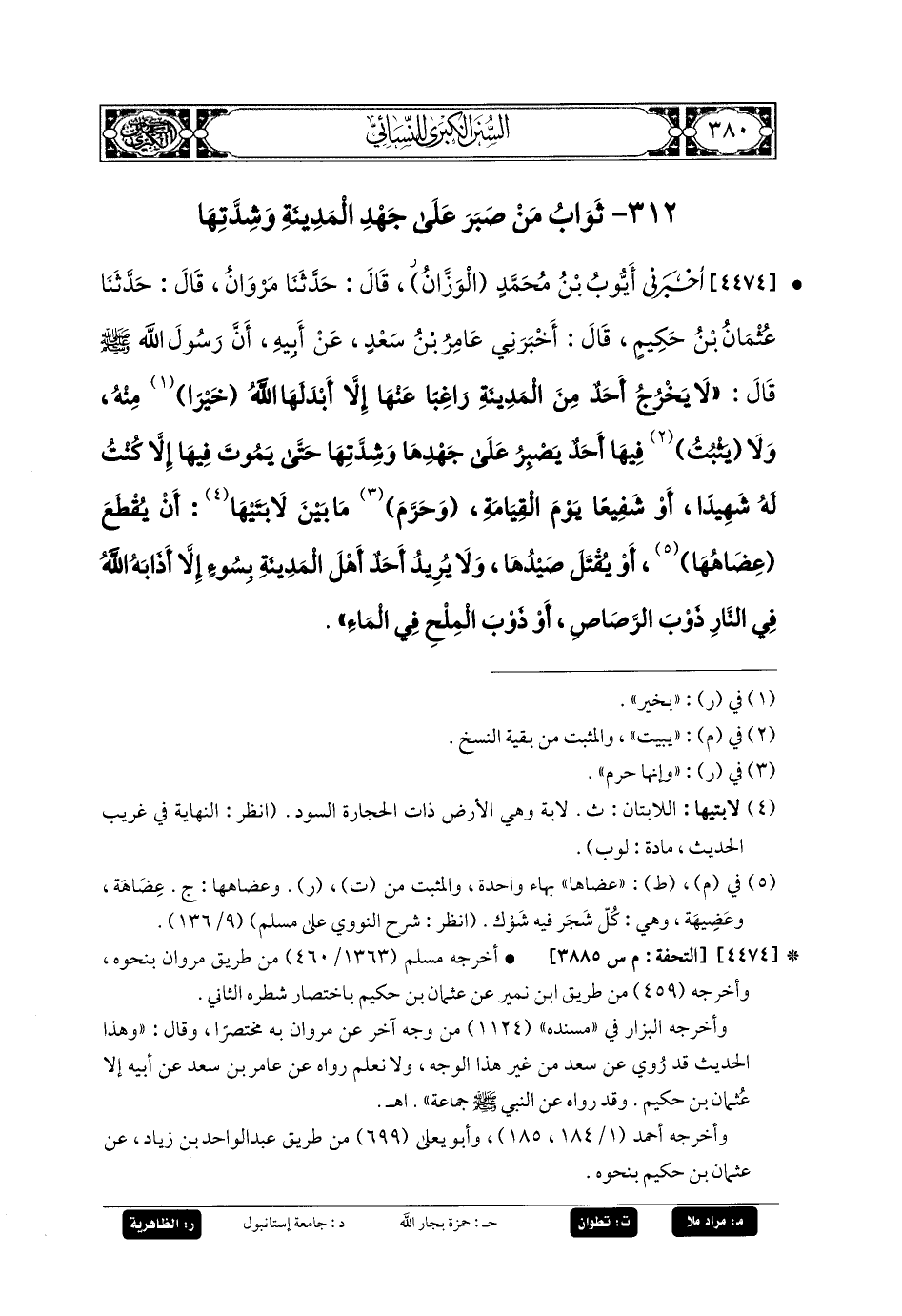 4474- أَخبَرني أَيوبُ بنُ مُحَمدٍ الوَزَّانُ، قَالَ: حَدَّثنا مَرْوَانُ، قَالَ: حَدَّثنا عُثْمَانُ بنُ حَكِيمٍ، قَالَ: أَخبَرني عَامِرُ بنُ سَعْدٍ، عَن أَبيهِ، أَنَّ رَسُولَ اللهِ صَلى الله عَليه وسَلم قَالَ: لا يَخْرُجُ أَحَدٌ مِنَ المَدِينَةِ رَاغِبًا عَنهَا إِلاَّ أَبْدَلَهَا اللهُ خَيْرًا مِنْهُ، وَلا يَثْبُتُ فِيهَا أَحَدٌ يَصْبِرُ عَلَى جَهْدِهَا وَشِدَّتِهَا حَتَّى يَمُوتَ فِيهَا، إِلاَّ كُنْتُ لَهُ شَهِيدًا أَوْ شَفِيعًا يَوْمَ القِيَامَةِ، وَحرَّمَ مَا بَيْنَ لابَتَيْهَا أَنْ يُقْطَعَ عِضَاهُهَا أَوْ يُقْتَلَ صَيْدُهَا، وَلا يُرِيدُ أَحَدٌ أَهْلَ المَدِينَةِ بِسُوءٍ إِلاَّ أَذَابَهُ اللهُ فِي النَّارِ ذَوْبَ الرَّصَاصِ أَوْ ذَوْبَ المِلْحِ فِي المَاءِ.