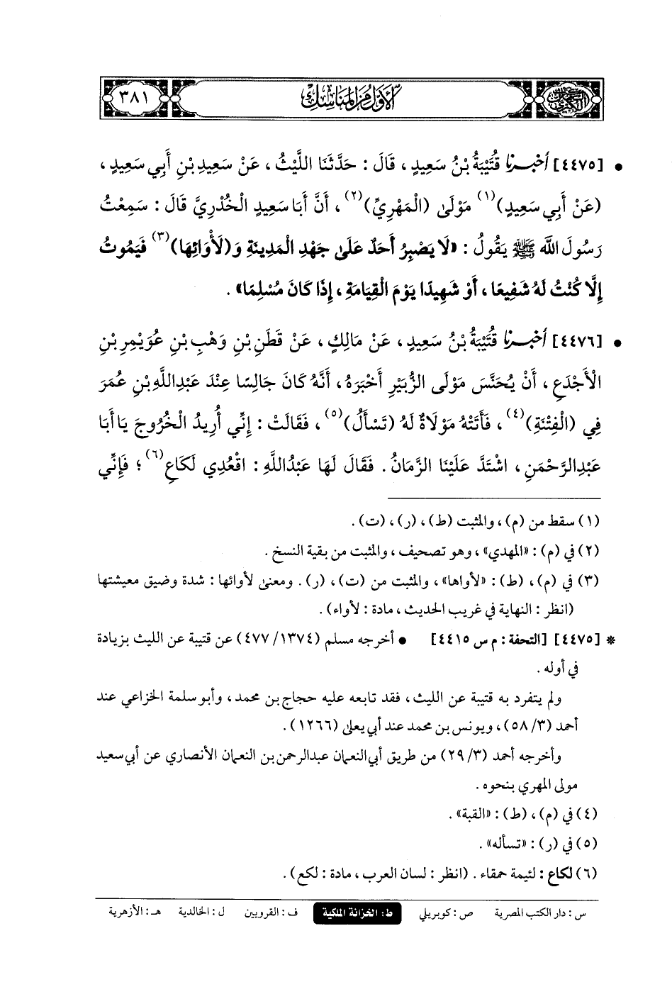 4475- أَخبَرنا قُتَيبَةُ بنُ سَعِيدٍ، قَالَ: حَدَّثنا اللَّيْثُ، عَن سَعِيدِ بنِ أَبي سَعِيدٍ، عَن أَبي سَعِيدٍ، مَوْلَى المَهْرِيِّ، أَنَّ أَبَا سَعِيدٍ الخُدْرِيَّ، قَالَ: سَمِعْتُ رَسُولَ اللهِ صَلى الله عَليه وسَلم يَقُولُ: لا يَصْبِرُ أَحَدٌ عَلَى جَهْدِ المَدِينَةِ وَلأْوَائِهَا فَيَمُوتُ، إِلاَّ كُنْتُ لَهُ شَفِيعًا أَوْ شَهِيدًا يَوْمَ القِيَامَةِ إِذَا كَانَ مُسْلِمًا.