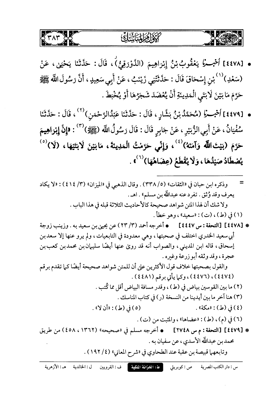 4478- أَخبَرنا يَعقُوبُ بنُ إِبرَاهِيمَ الدَّوْرَقِيُّ، قَالَ: حَدَّثنا يَحيَى، عَن سَعْدِ بنِ إِسحَاقَ، قَالَ: حَدَّثَتْنِي زَيْنَبُ، عَن أَبي سَعِيدٍ، أَنَّ رَسُولَ اللهِ صَلى الله عَليه وسَلم حَرَّمَ مَا بَيْنَ لابَتَيِ المَدِينَةِ أَنْ يُعْضَدَ شَجَرُهَا أَوْ يُخْبَطَ.