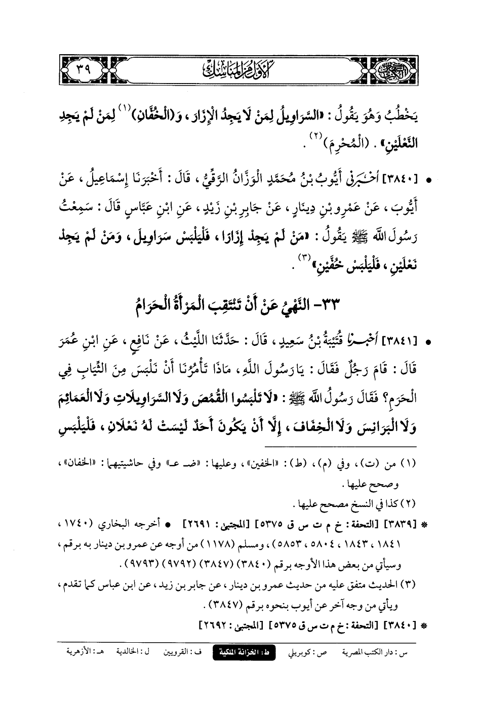 3840- أَخبَرني أَيوبُ بنُ مُحَمدٍ الوَزَّانُ الرَّقِّيُّ، قَالَ: أَخبَرنا إِسمَاعِيلُ، عَن أَيوبَ، عَن عَمْرِو بنِ دِينَارٍ، عَن جَابِرِ بنِ زَيْدٍ، عَنِ ابنِ عَبَّاسٍ، قَالَ: سَمِعْتُ رَسُولَ اللهِ صَلى الله عَليه وسَلم يَقُولُ: مَنْ لَمْ يَجِدْ إِزَارًا فَلْيَلْبَسْ سَرَاوِيلَ، وَمَنْ لَمْ يَجِدْ نَعْلَيْنِ فَلْيَلْبَسْ خُفَّيْنِ.