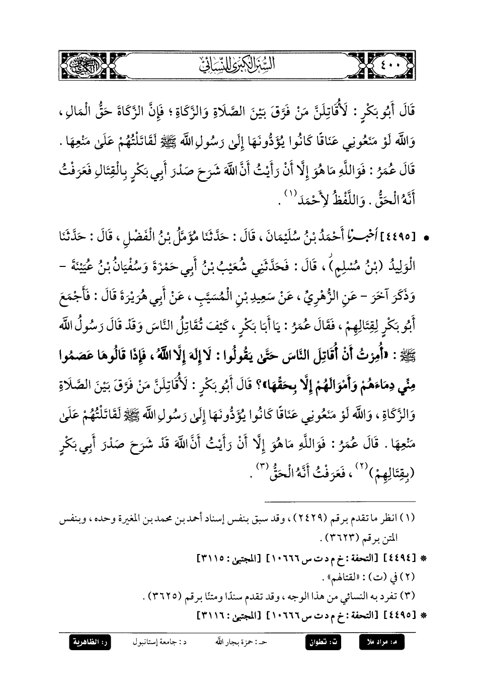 4495- أَخبَرنا أَحْمَدُ بنُ سُلَيمَانَ، قَالَ: حَدَّثنا مُؤَمَّلُ بنُ الفَضْلِ، قَالَ: حَدَّثنا الوَلِيدُ بنُ مُسْلِمٍ، قَالَ: فَحَدَّثني شُعَيبُ بنُ أَبي حَمْزَةَ، وَسُفيانُ بنُ عُيَيْنَةَ، وَذَكَرَ آخَرَ، عَنِ الزُّهْرِيِّ، عَن سَعِيدِ بنِ المُسَيَّبِ، عَن أَبي هُرَيرَةَ قَالَ: فَأَجْمَعَ أَبو بَكْرٍ لِقِتَالِهِمْ، فَقَالَ عُمَرُ: يَا أَبَا بَكْرٍ، كَيْفَ تُقَاتِلُ النَّاسَ، وَقَدْ قَالَ رَسُولُ اللهِ صَلى الله عَليه وسَلم: أُمِرْتُ أَنْ أُقَاتِلَ النَّاسَ حَتَّى يَقُولُوا: لا إِلَهَ إِلاَّ اللهُ، فَإِذَا قَالُوهَا عَصَمُوا مِنِّي دِمَاءَهُمْ وَأَمْوَالَهُمْ إِلاَّ بِحَقِّهَا؟ قَالَ أَبو بَكْرٍ: لأُقَاتِلَنَّ مَنْ فَرَّقَ بَيْنَ الصَّلاةِ وَالزَّكَاةِ، وَاللهِ لَوْ مَنَعُونِي عَنَاقًا كَانُوا يُؤَدُّونَهَا إِلَى رَسُولِ اللهِ صَلى الله عَليه وسَلم لَقَاتَلْتُهُمْ عَلَى مَنْعِهَا، قَالَ عُمَرُ: فَوَاللَّهِ مَا هُوَ إِلاَّ أَنْ رَأَيْتُ أَنَّ اللهَ قَدْ شَرَحَ صَدْرَ أَبي بَكْرٍ بِقِتَالِهِمْ، فَعَرَفْتُ أَنَّهُ الحَقُّ.