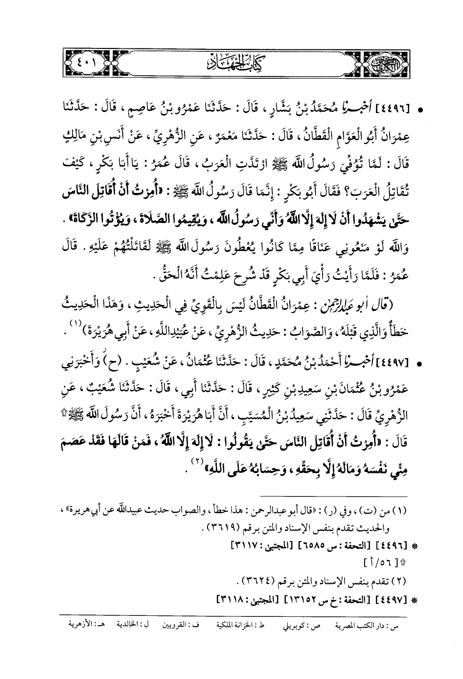 4496- أَخبَرنا مُحَمدُ بنُ بَشَّارٍ، قَالَ: حَدَّثنا عَمرُو بنُ عَاصِمٍ، قَالَ: حَدَّثنا عِمْرَانُ أَبو العَوَّامِ القَطَّانُ، قَالَ: حَدَّثنا مَعْمَرٌ، عَنِ الزُّهْرِيِّ، عَن أَنَسِ بنِ مَالِكٍ قَالَ: لَمَّا تُوُفِّيَ رَسُولُ اللهِ صَلى الله عَليه وسَلم، ارْتَدَّتِ العَرَبُ، قَالَ عُمَرُ: يَا أَبَا بَكْرٍ، كَيْفَ تُقَاتِلُ العَرَبَ؟ فَقَالَ أَبو بَكْرٍ: إِنَّمَا قَالَ رَسُولُ اللهِ صَلى الله عَليه وسَلم: أُمِرْتُ أَنْ أُقَاتِلَ النَّاسَ حَتَّى يَشْهَدُوا: أَنَّ لا إِلَهَ إِلاَّ اللهُ، وَأَنِّي رَسُولُ اللهِ، وَيُقِيمُوا الصَّلاةَ، وَيُؤْتُوا الزَّكَاةَ، وَاللهِ لَوْ مَنَعُونِي عَنَاقًا مِمَّا كَانُوا يُعْطُونَ رَسُولَ اللهِ صَلى الله عَليه وسَلم لَقَاتَلْتُهُمْ عَلَيْهِ، قَالَ عُمَرُ: فَلَمَّا رَأَيْتُ رَأْيَ أَبي بَكْرٍ قَدْ شُرِحَ، عَلِمْتُ أَنَّهُ الحَقُّ.