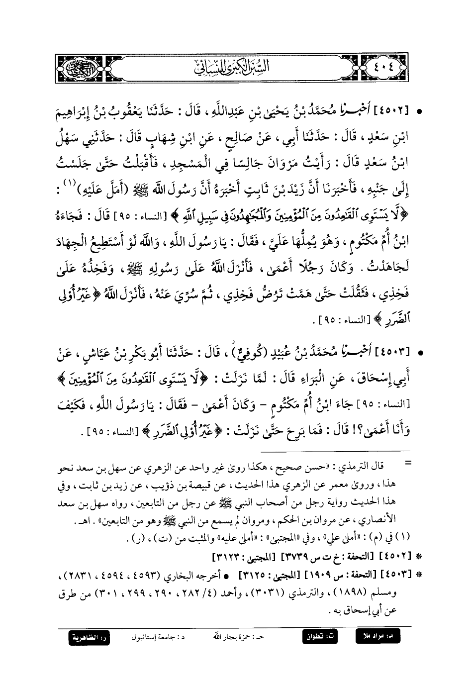 4503- أَخبَرنا مُحَمدُ بنُ عُبَيدٍ، كُوفِيٌّ، قَالَ: حَدَّثنا أَبو بَكْرٍ بنُ عَيَّاشٍ، عَن أَبي إِسحَاقَ، عَنِ البَرَاءِ قَالَ: لَمَّا نَزَلَتْ: {لا يَسْتَوِي القَاعِدُونَ مِنَ المُؤْمِنِينَ} جَاءَ ابْنُ أُمِّ مَكْتُومٍ، وَكَانَ أَعْمَى فَقَالَ: يَا رَسُولَ اللهِ، فَكَيْفَ وَأَنَا أَعْمَى؟ قَالَ: فَمَا بَرِحَ حَتَّى نَزَلَتْ: {غَيْرُ أُولِي الضَّرَرِ}.