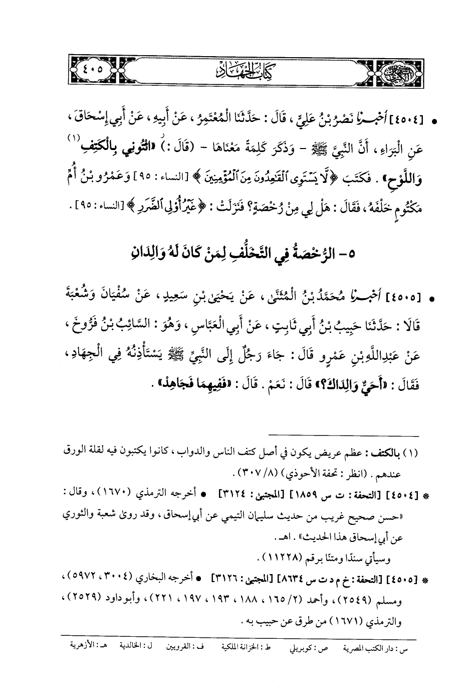 4505- أَخبَرنا مُحَمدُ بنُ المُثَنَّى، عَن يَحيَى بنِ سَعِيدٍ، عَن سُفيانَ، وَشُعْبَةَ، قَالا: حَدَّثنا حَبِيبُ بنُ أَبي ثَابِتٍ، عَن أَبي العَبَّاسِ، وَهُوَ السَّائِبُ بنُ فَرُّوخَ، عَن عَبدِ اللهِ بنِ عَمْرٍو قَالَ: جَاءَ رَجُلٌ إِلَى النَّبيِّ صَلى الله عَليه وسَلم يَسْتَأْذِنُهُ فِي الجِهَادِ، فَقَالَ: أَحَيٌّ وَالِدَاكَ؟ قَالَ: نَعَمْ، قَالَ: فَفِيهِمَا فَجَاهِدْ.