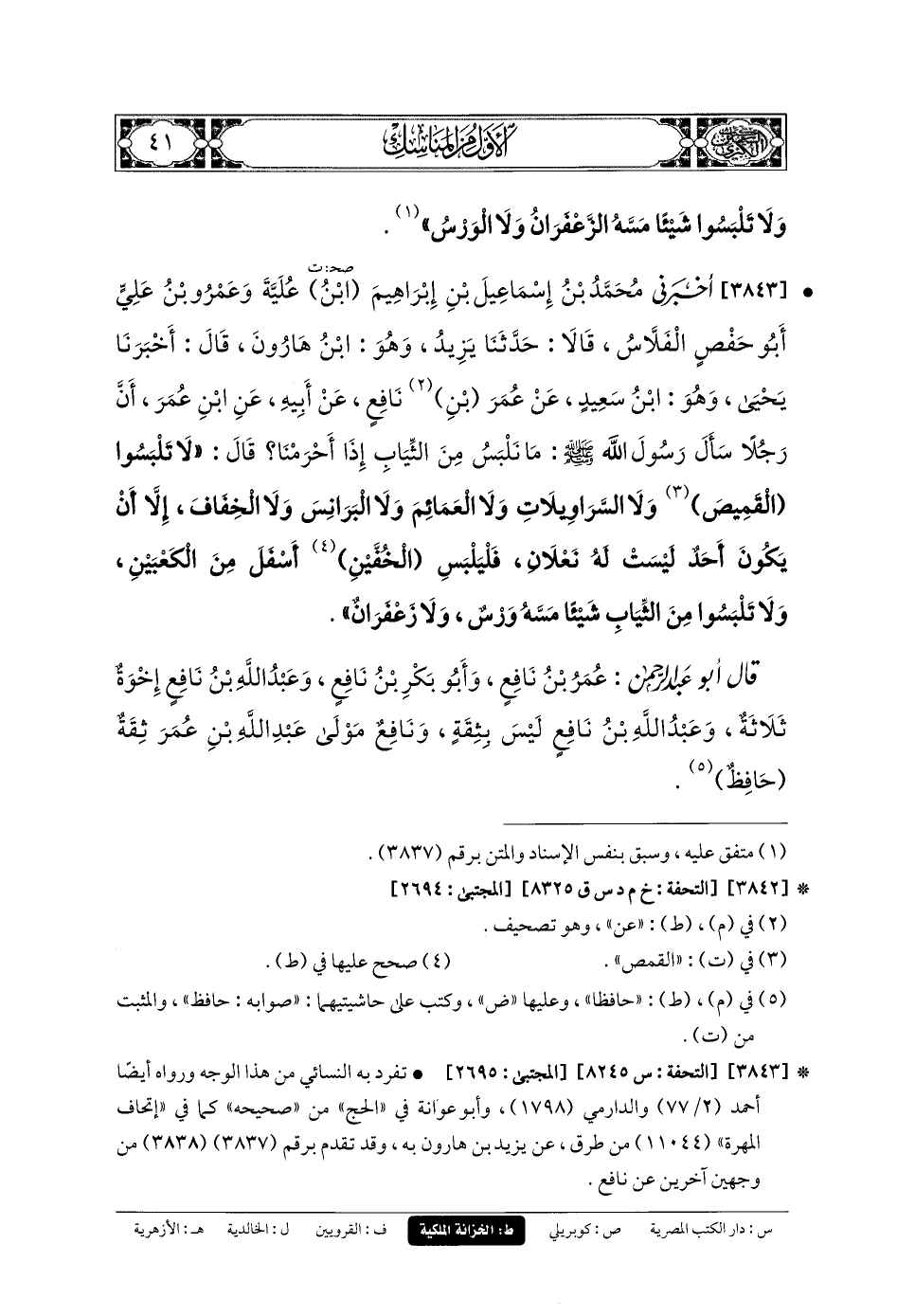 3843- أَخبَرني مُحَمدُ بنُ إِسمَاعِيلَ بنِ إِبرَاهِيمَ ابنِ عُلَيَّةَ، وَعَمرُو بنُ عَليٍّ أَبو حَفْصٍ الفَلاَّسُ، قَالا: حَدَّثنا يَزِيدُ، وَهُوَ ابْنُ هَارُونَ، قَالَ: أَخبَرنا يَحيَى، وَهُوَ ابْنُ سَعِيدٍ، عَن عُمَرَ بنِ نَافِعٍ، عَن أَبيهِ، عَنِ ابنِ عُمَرَ، أَنَّ رَجُلاً سَأَلَ رَسُولَ اللهِ صَلى الله عَليه وسَلم مَا نَلْبَسُ مِنَ الثِّيَابِ إِذَا أَحْرَمْنَا؟ قَالَ: لا تَلْبَسُوا القَمِيصَ، وَلا السَّرَاوِيلاتِ، وَلا العَمَائِمَ، وَلا البَرَانِسَ، وَلا الخِفَافَ، إِلاَّ أَنْ يَكُونَ أَحَدٌ لَيْسَتْ لَهُ نَعْلانِ فَلْيَلْبَسِ الخُفَّيْنِ أَسْفَلَ مِنَ الكَعْبَيْنِ، وَلا تَلْبَسُوا مِنَ الثِّيَابِ شَيْئًا مَسَّهُ وَرْسٌ وَلا زَعْفَرَانٌ.