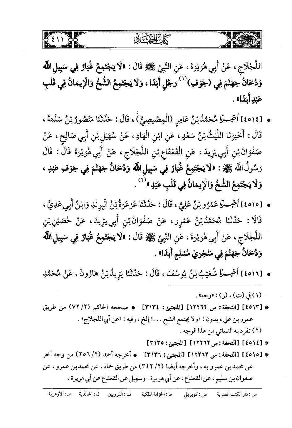 4516- أَخبَرنا شُعَيبُ بنُ يُوسُفَ، قَالَ: حَدَّثنا يَزِيدُ بنُ هَارُونَ، عَن مُحَمدِ بنِ عَمْرٍو، عَن صَفْوَانَ بنِ يَزِيدَ، عَن حُصَيْنِ بنِ اللَّجْلاجِ، عَن أَبي هُرَيرَةَ قَالَ: قَالَ رَسُولُ اللهِ صَلى الله عَليه وسَلم: لا يَجْتَمِعُ غُبَارٌ فِي سَبِيلِ اللهِ، وَدُخَانُ جَهَنَّمَ فِي مِنْخَرَيْ مُسْلِمٍ، وَلا يَجْتَمِعُ الشُّحُّ وَإِيمَانٌ فِي قَلْبِ رَجُلٍ مُسْلِمٍ.