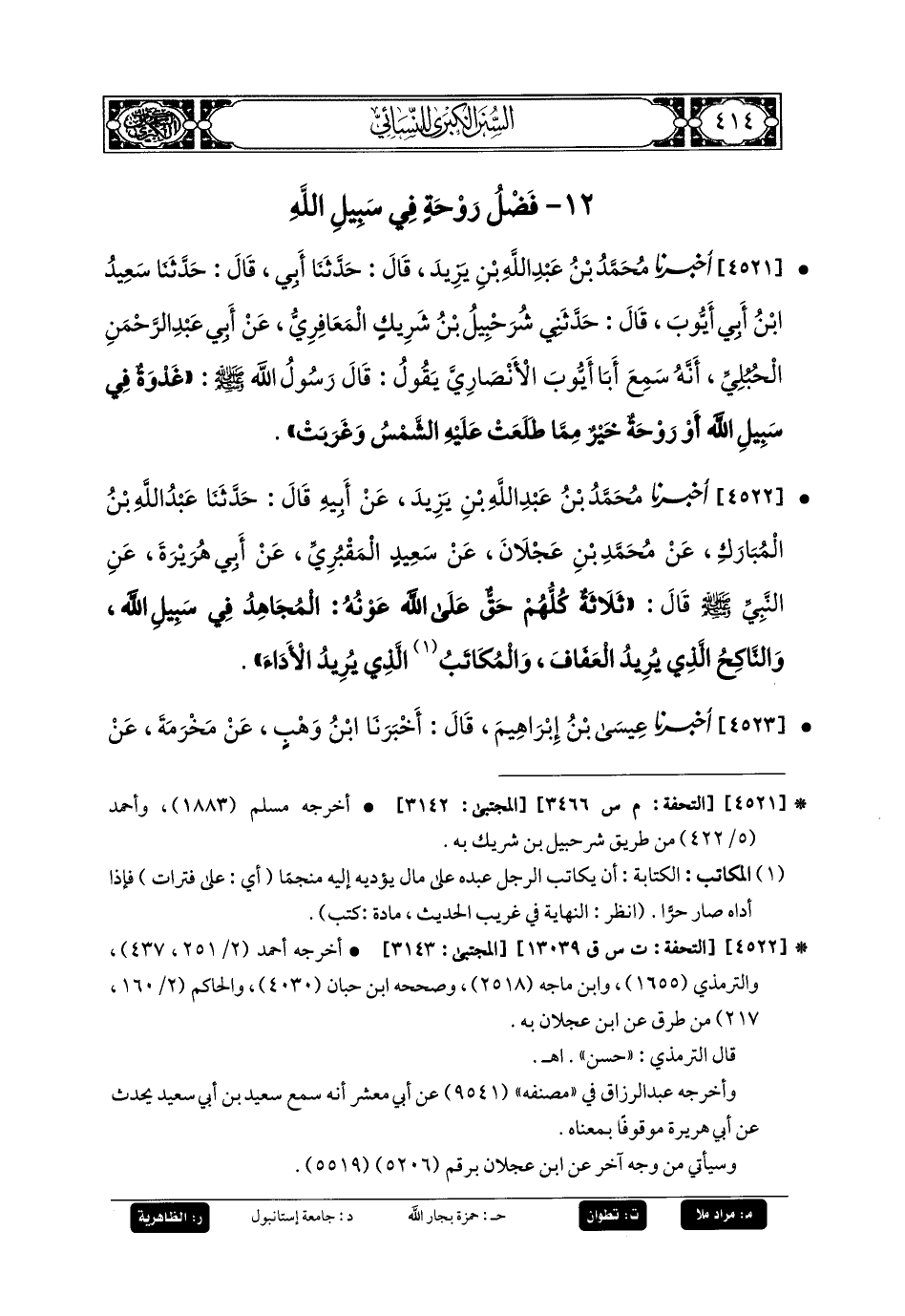 4521- أَخبَرنا مُحَمدُ بنُ عَبدِ اللهِ بنِ يَزِيدَ، قَالَ: حَدَّثنا أَبي، قَالَ: حَدَّثنا سَعِيدُ بنُ أَبي أَيوبَ، قَالَ: حَدَّثني شُرَحْبِيلُ بنُ شَرِيكٍ المَعَافِرِيُّ، عَن أَبي عَبدِ الرَّحمَنِ الحُبُلِيِّ، أَنَّهُ سَمِعَ أَبَا أَيوبَ الأَنْصَارِيَّ يَقُولُ: قَالَ رَسُولُ اللهِ صَلى الله عَليه وسَلم: غَدْوَةٌ فِي سَبِيلِ اللهِ أَوْ رَوْحَةٌ خَيْرٌ مِمَّا طَلَعَتْ عَلَيْهِ الشَّمْسُ وَغَرَبَتْ.