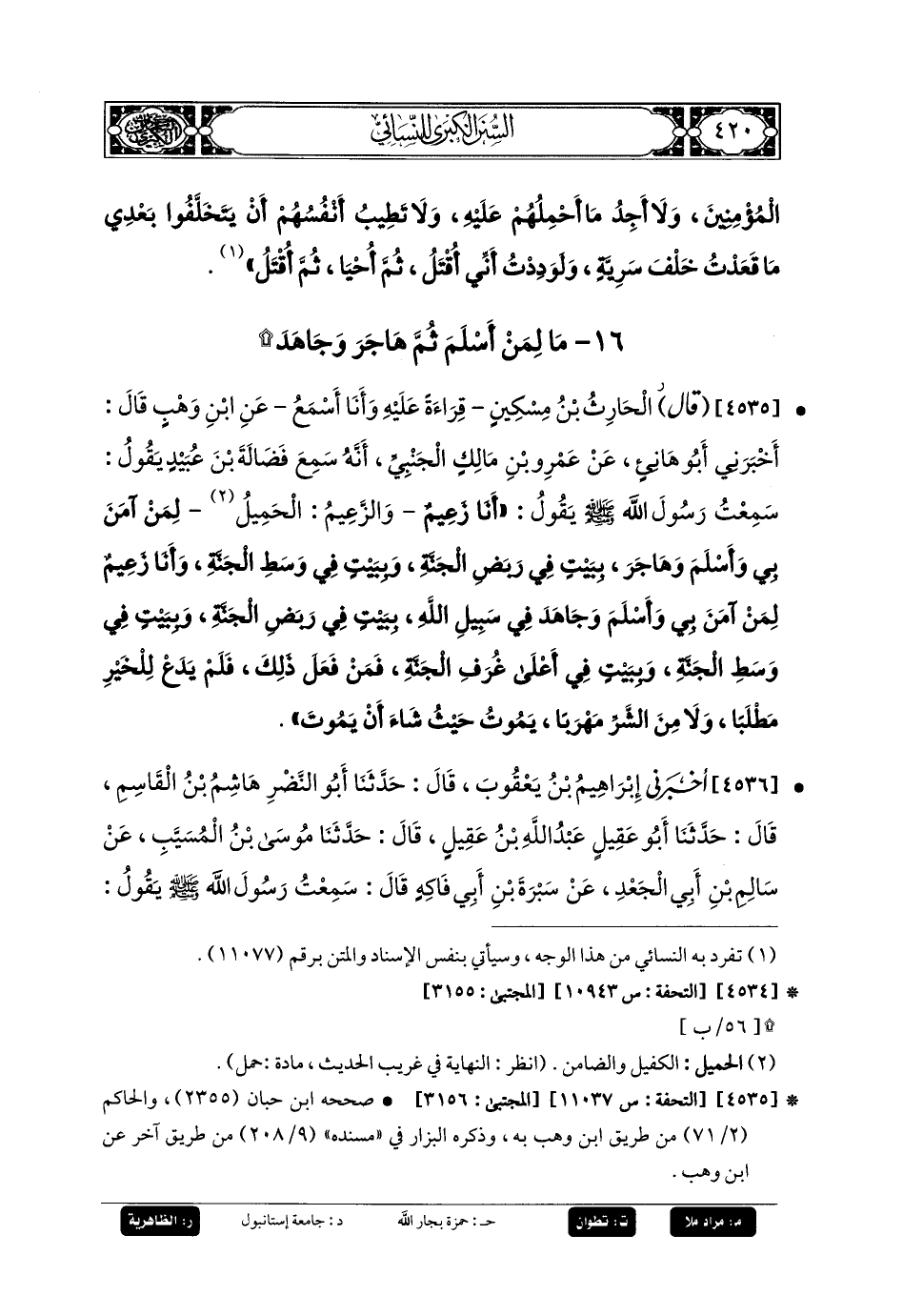 4535- قال الحَارِثُ بنُ مِسْكِينٍ، قِرَاءَةً عَلَيْهِ، وَأَنَا أَسْمَعُ، عَنِ ابنِ وَهْبٍ، قَالَ: أَخبَرني أَبو هَانِئٍ، عَن عَمْرِو بنِ مَالِكٍ الجَنْبِيِّ، أَنَّهُ سَمِعَ فَضَالَّةَ بْنَ عُبَيدٍ يَقُولُ: سَمِعْتُ رَسُولَ اللهِ صَلى الله عَليه وسَلم يَقُولُ: أَنَا زَعِيمٌ، وَالزَّعِيمُ الحَمِيلُ لِمَنْ آمَنَ بِي وَأَسْلَمَ، وَهَاجَرَ بِبَيْتٍ فِي رَبَضِ الجَنَّةِ، وَبِبَيْتٍ فِي وَسَطِ الجَنَّةِ، وَأَنَا زَعِيمٌ لِمَنْ آمَنَ بِي، وَأَسْلَمَ وَجَاهَدَ فِي سَبِيلِ اللهِ بِبَيْتٍ فِي رَبَضِ الجَنَّةِ، وَبِبَيْتٍ فِي وَسَطِ الجَنَّةِ، وَبِبَيْتٍ فِي أَعَلَى غُرَفِ الجَنَّةِ، فَمَنْ فَعَلَ ذَلِكَ فَلَمْ يَدَعْ لِلْخَيْرِ مَطْلَبًا، وَلا مِنَ الشَّرِّ مَهْرَبًا يَمُوتُ حَيْثُ شَاءَ أَنْ يَمُوتَ.
