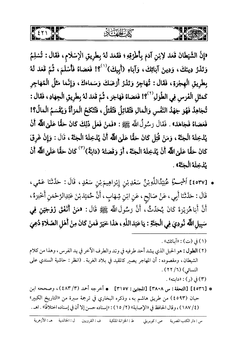 4537- أَخبَرنا عُبَيدُ اللهِ بنُ سَعْدِ بنِ إِبرَاهِيمَ بنِ سَعْدٍ، قَالَ: حَدَّثنا عَمِّي، قَالَ: حَدَّثنا أَبي، عَن صَالِحٍ، عَنِ ابنِ شِهَابٍ، أَنَّ حُمَيْدَ بْنَ عَبدِ الرَّحمَنِ أَخبَرَهُ؛ أَنَّ أَبَا هُرَيرَةَ كَانَ يُحَدِّثُ، أَنَّ رَسُولَ اللهِ صَلى الله عَليه وسَلم قَالَ: مَنْ أَنْفَقَ زَوْجَيْنِ فِي سَبِيلِ اللهِ نُودِيَ فِي الجَنَّةِ يَا عَبدَ اللهِ، هَذَا خَيْرٌ، فَمَنْ كَانَ مِنْ أَهْلِ الصَّلاةِ، دُعِيَ مِنْ بَابِ الصَّلاةِ، وَمَنْ كَانَ مِنْ أَهْلِ الجِهَادِ، دُعِيَ مِنْ بَابِ الجِهَادِ، وَمَنْ كَانَ مِنْ أَهْلِ الصَّدَقَةِ، دُعِيَ مِنْ بَابِ الصَّدَقَةِ، وَمَنْ كَانَ مِنْ أَهْلِ الصِّيَامِ، دُعِيَ مِنْ بَابِ الصِّيَامِ، فَقَالَ أَبو بَكْرٍ: يَا نَبِيَّ اللهِ مَا عَلَى الَّذِي يُدْعَى مِنْ تِلْكَ الأَبْوَابِ مِنْ ضَرُورَةٍ، فَهَلْ يُدْعَى أَحَدٌ مِنْ تِلْكَ الأَبْوَابِ كُلِّهَا؟ قَالَ: نَعَمْ، وَأَرْجُو أَنْ تَكُونَ مِنْهُمْ.