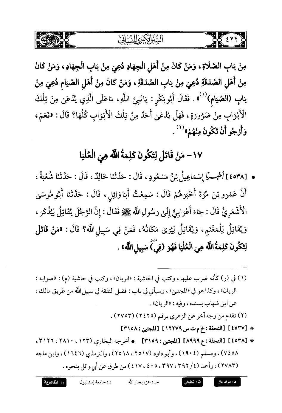 4538- أَخبَرنا إِسمَاعِيلُ بنُ مَسْعُودٍ، قَالَ: حَدَّثنا خَالِدٌ، قَالَ: حَدَّثنا شُعْبَةُ، أَنَّ عَمْرَو بْنَ مُرَّةَ أَخبَرَهُمْ، قَالَ: سَمِعْتُ أَبَا وَائِلٍ، قَالَ: حَدَّثنا أَبو مُوسَى الأَشْعَرِيُّ قَالَ: جَاءَ أَعْرَابِيٌّ إِلَى رَسُولِ اللهِ صَلى الله عَليه وسَلم فَقَالَ: إِنَّ الرَّجُلَ يُقَاتِلُ لِيُذْكَرَ، وَيُقَاتِلُ لِلْمَغْنَمِ، وَيُقَاتِلُ لِيُرَى مَكَانُهُ، فَمَنْ فِي سَبِيلِ اللهِ؟ قَالَ: مَنْ قَاتَلَ لِتَكُونَ كَلِمَةُ اللهِ هِيَ العُلْيَا فَهُوَ فِي سَبِيلِ اللهِ.