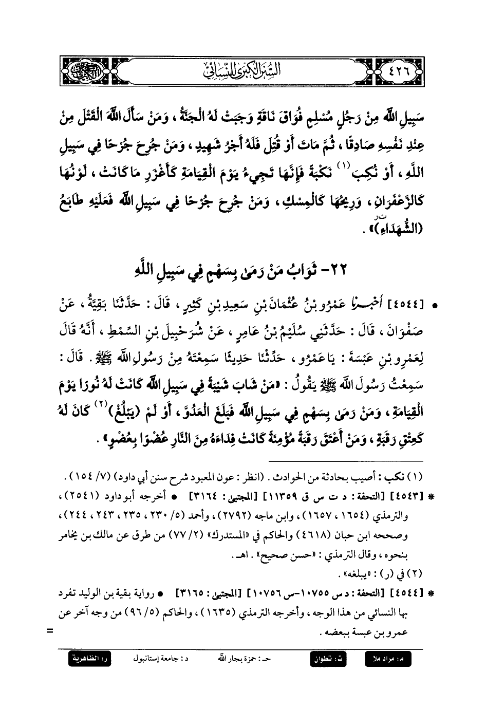 4544- أَخبَرنا عَمرُو بنُ عُثْمَانَ بنِ سَعِيدِ بنِ كَثِيرٍ، قَالَ: حَدَّثنا بَقِيَّةُ، عَن صَفْوَانَ، قَالَ: حَدَّثني سُلَيْمُ بنُ عَامِرٍ، عَن شُرَحْبِيلِ بنِ السِّمْطِ، أَنَّهُ قَالَ لِعَمْرِو بنِ عَبَسَةَ: يَا عَمرُو، حَدِّثْنَا حَدِيثًا سَمِعْتَهُ مِنْ رَسُولِ اللهِ صَلى الله عَليه وسَلم، قَالَ: سَمِعْتُ رَسُولَ اللهِ صَلى الله عَليه وسَلم يَقُولُ: مَنْ شَابَ شَيْبَةً فِي سَبِيلِ اللهِ كَانَتْ لَهُ نُورًا يَوْمَ القِيَامَةِ، وَمَنْ رَمَى بِسَهْمٍ فِي سَبِيلِ اللهِ فَبَلَغَ العَدُوَّ أَوْ لَمْ يَبْلُغْ كَانَ لَهُ كَعِتْقِ رَقَبَةٍ، وَمَنْ أَعْتَقَ رَقَبَةً مُؤْمِنَةً كَانَتْ فِدَاءَهُ مِنَ النَّارِ عُضْوًا بِعُضْوٍ.