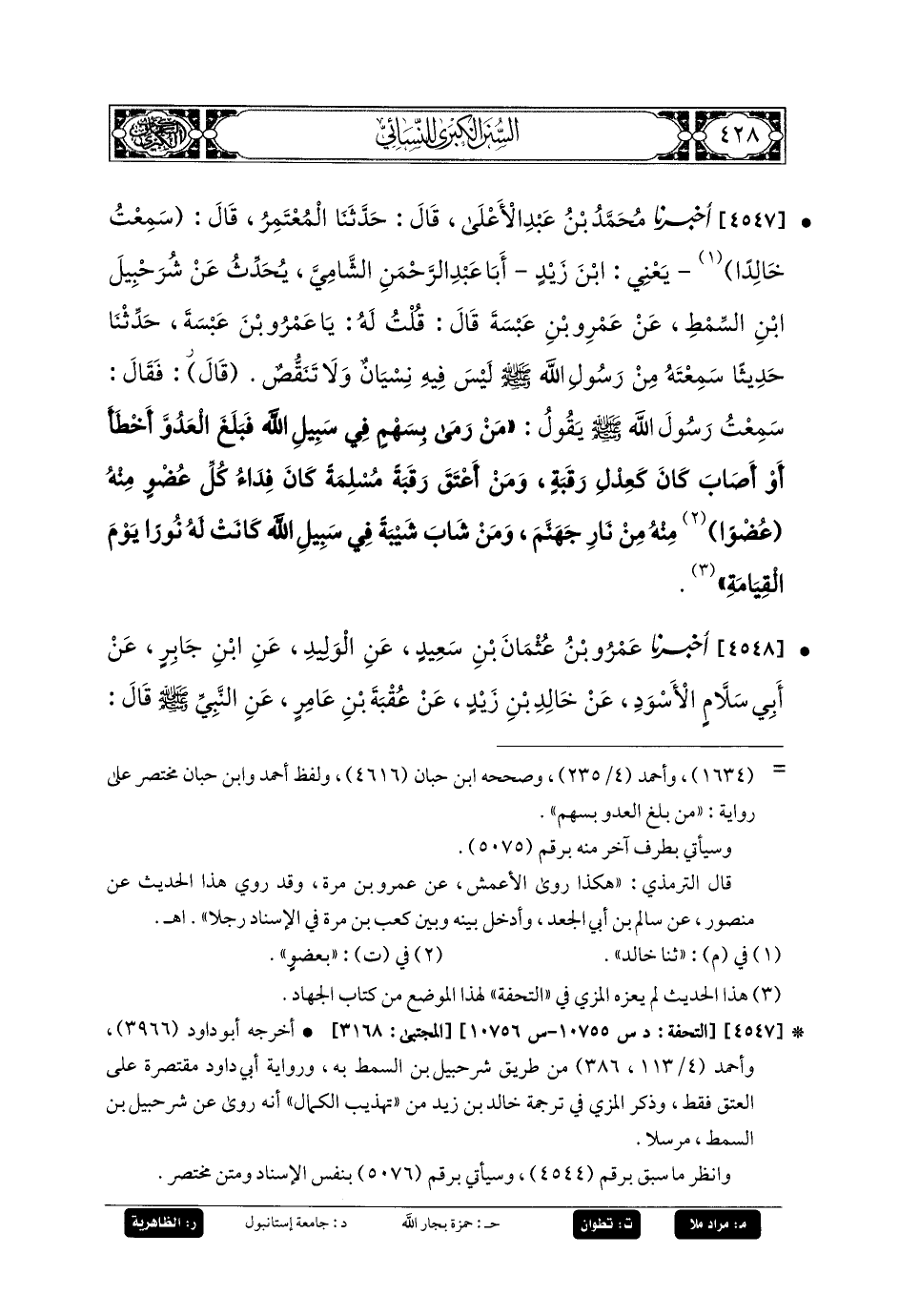 4547- أَخبَرنا مُحَمدُ بنُ عَبدِ الأَعْلَى، قَالَ: حَدَّثنا المُعْتَمِرُ، قَالَ: سَمِعْتُ خَالِدًا، يَعْنِي ابْنَ زَيْدٍ أَبَا عَبدِ الرَّحمَنِ الشَّامِيَّ، يُحَدِّثُ عَن شُرَحْبِيلِ بنِ السِّمْطِ، عَن عَمْرِو بنِ عَبَسَةَ قَالَ: قُلْتُ لَهُ: يَا عَمرُو بنُ عَبَسَةَ، حَدِّثْنَا حَدِيثًا سَمِعْتُهُ مِنْ رَسُولِ اللهِ صَلى الله عَليه وسَلم لَيْسَ فِيهِ نِسْيَانٌ وَلا تنْقُصٌ، قال: فَقَالَ: سَمِعْتُ رَسُولَ اللهِ صَلى الله عَليه وسَلم يَقُولُ: مَنْ رَمَى بِسَهْمٍ فِي سَبِيلِ اللهِ فَبَلَغَ العَدُوَّ، أَخْطَأَ أَوْ أَصَابَ كَانَ كَعِدْلِ رَقَبَةٍ، وَمَنْ أَعْتَقَ رَقَبَةً مُسْلِمَةً كَانَ فِدَاءُ كُلِّ عُضْوٍ مِنْهُ عُضْوًا مِنْهُ مِنْ نَارِ جَهَنَّمَ، وَمَنْ شَابَ شَيْبَةً فِي سَبِيلِ اللهِ كَانَتْ لَهُ نُورًا يَوْمَ القِيَامَةِ.