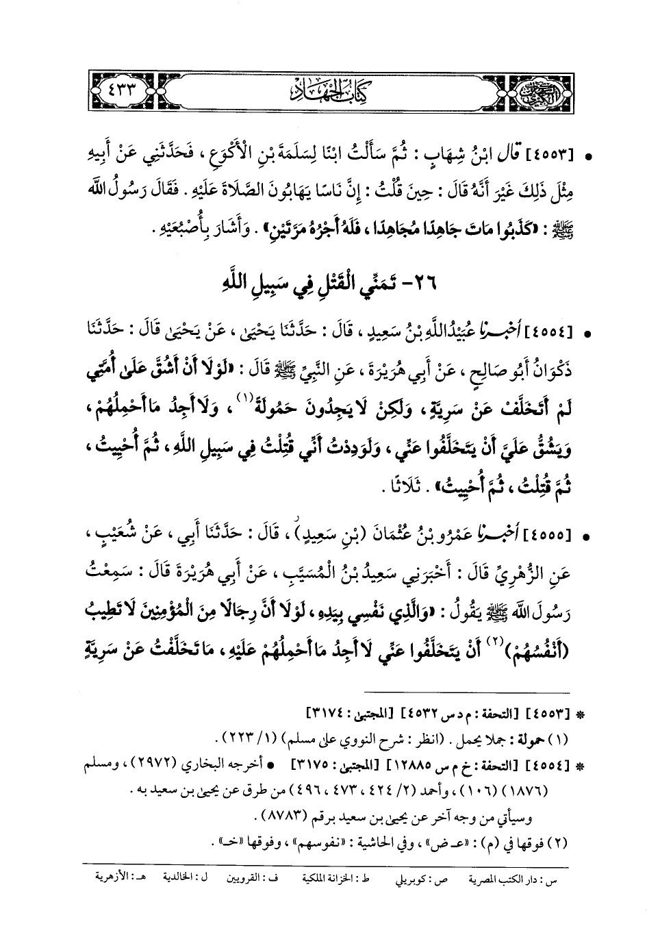 4555- أَخبَرنا عَمرُو بنُ عُثْمَانَ بنِ سَعِيدٍ، قَالَ: حَدَّثنا أَبي، عَن شُعَيبٍ، عَنِ الزُّهْرِيِّ، قَالَ: أَخبَرني سَعِيدُ بنُ المُسَيَّبِ، عَن أَبي هُرَيرَةَ، قَالَ: سَمِعْتُ رَسُولَ اللهِ صَلى الله عَليه وسَلم يَقُولُ: وَالَّذِي نَفْسِي بِيَدِهِ، لَوْلا أَنَّ رِجَالاً مِنَ المُؤْمِنِينَ لا تَطِيبُ أَنْفُسُهُمْ أَنْ يَتَخَلَّفُوا عَنِّي، لا أَجِدُ مَا أَحْمِلُهُمْ عَلَيْهِ، مَا تَخَلَّفْتُ عَن سَرِيَّةٍ تَغْزُو فِي سَبِيلِ اللهِ، وَالَّذِي نَفْسِي بِيَدِهِ، لَوَدِدْتُ أَنِّي أُقْتَلُ فِي سَبِيلِ اللهِ، ثُمَّ أُحْيَا، ثُمَّ أُقْتَلُ، ثُمَّ أُحْيَا، ثُمَّ أُقْتَلُ.