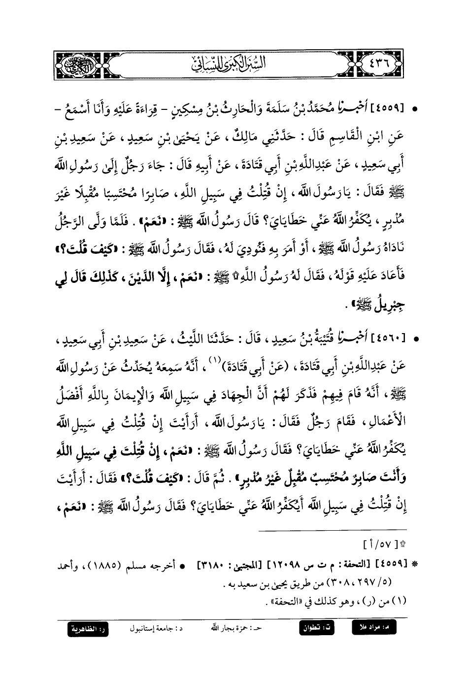 4560- أَخبَرنا قُتَيبَةُ بنُ سَعِيدٍ، قَالَ: حَدَّثنا اللَّيْثُ، عَن سَعِيدِ بنِ أَبي سَعِيدٍ، عَن عَبدِ اللهِ بنِ أَبي قَتَادَةَ، عَن أَبي قَتَادَةَ أَنَّهُ سَمِعَهُ يُحَدِّثُ عنْ رَسُولِ اللهِ صَلى الله عَليه وسَلم أَنَّهُ قَامَ فِيهِمْ فَذَكَرَ لَهُمْ أَنَّ الجِهَادَ فِي سَبِيلِ اللهِ وَالإِيمَانَ بِاللهِ أَفْضَلُ الأَعْمَالِ، فَقَامَ رَجُلٌ فَقَالَ: يَا رَسُولَ اللهِ، أَرَأَيْتَ إِنْ قُتِلْتُ فِي سَبِيلِ اللهِ يكَفَّرُ الله عَنِّي خَطَايَايَ؟ فَقَالَ رَسُولُ اللهِ صَلى الله عَليه وسَلم: نَعَمْ إِنْ قُتِلْتَ فِي سَبِيلِ اللهِ، وَأَنْتَ صَابِرٌ مُحْتَسِبٌ مُقْبِلٌ غَيْرُ مُدْبِرٍ، ثُمَّ قَالَ: كَيْفَ قُلْتَ؟ فَقَالَ: أَرَأَيْتَ إِنْ قُتِلْتُ فِي سَبِيلِ اللهِ، أَيكَفَّرُ الله عَنِّي خَطَايَايَ؟ فَقَالَ رَسُولُ اللهِ صَلى الله عَليه وسَلم: نَعَمْ، إِنْ قُتِلْتَ فِي سَبِيلِ اللهِ وَأَنْتَ صَابِرٌ مُحْتَسِبٌ مُقْبِلٌ غَيْرُ مُدْبِرٍ إِلاَّ الدَّيْنَ، فَإِنَّ جِبْرِيلَ قَالَ لِي ذَلِكَ.