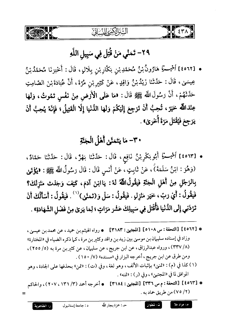 4562- أَخبَرنا هَارُونُ بنُ مُحَمدِ بنِ بَكَّارِ بنِ بِلالٍ، قَالَ: أَخبَرنا مُحَمدُ بنُ عِيسَى، قَالَ: حَدَّثنا زَيْدُ بنُ وَاقِدٍ، عَن كَثِيرِ بنِ مُرَّةَ، أَنَّ عُبَادَةَ بْنَ الصَّامِتِ حَدَّثَهُمْ، أَنَّ رَسُولَ اللهِ صَلى الله عَليه وسَلم قَالَ: مَا عَلَى الأَرْضِ مِنْ نَفْسٍ تَمُوتُ وَلَهَا عِنْدَ اللهِ خَيْرٌ تُحِبُّ أَنْ تَرْجِعَ إِلَيْكُمْ وَلَهَا الدُّنْيَا، إِلاَّ القَتِيلُ فَإِنَّهُ يُحِبُّ أَنْ يَرْجِعَ فَيُقْتَلَ مَرَّةً أُخْرَى.