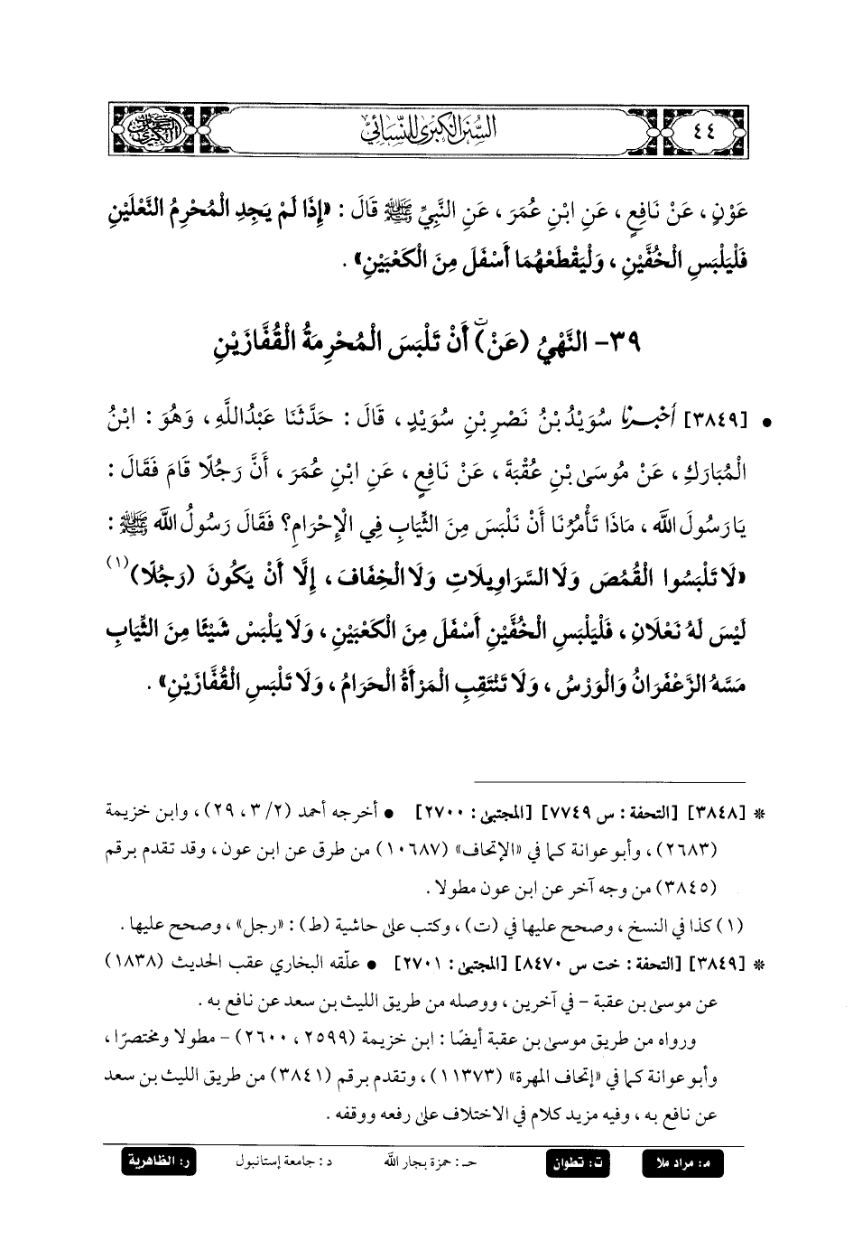 3849- أَخبَرنا سُوَيْدُ بنُ نَصْرِ بنِ سُوَيْدٍ، قَالَ: حَدَّثنا عَبدُ اللهِ، وَهُوَ ابْنُ المُبَارَكِ، عَن مُوسَى بنِ عُقْبَةَ، عَن نَافِعٍ، عَنِ ابنِ عُمَرَ، أَنَّ رَجُلاً قَامَ فَقَالَ: يَا رَسُولَ اللهِ، مَاذَا تَأْمُرُنَا أَنْ نَلْبَسَ مِنَ الثِّيَابِ فِي الإِحْرَامِ؟ فَقَالَ رَسُولُ اللهِ صَلى الله عَليه وسَلم: لا تَلْبَسُوا القُمُصَ، وَلا السَّرَاوِيلاتِ، وَلا الخِفَافَ، إِلاَّ أَنْ يَكُونَ رَجُلاً لَيْسَ لَهُ نَعْلانِ فَلْيَلْبَسِ الخُفَّيْنِ أَسْفَلَ مِنَ الكَعْبَيْنِ، وَلا يَلْبَسْ شَيْئًا مِنَ الثِّيَابِ مَسَّهُ الزَّعْفَرَانُ وَالوَرْسُ، وَلا تَنْتَقِبُ المَرْأَةُ الحَرَامُ، وَلا تَلْبَسُ القُفَّازَيْنِ.