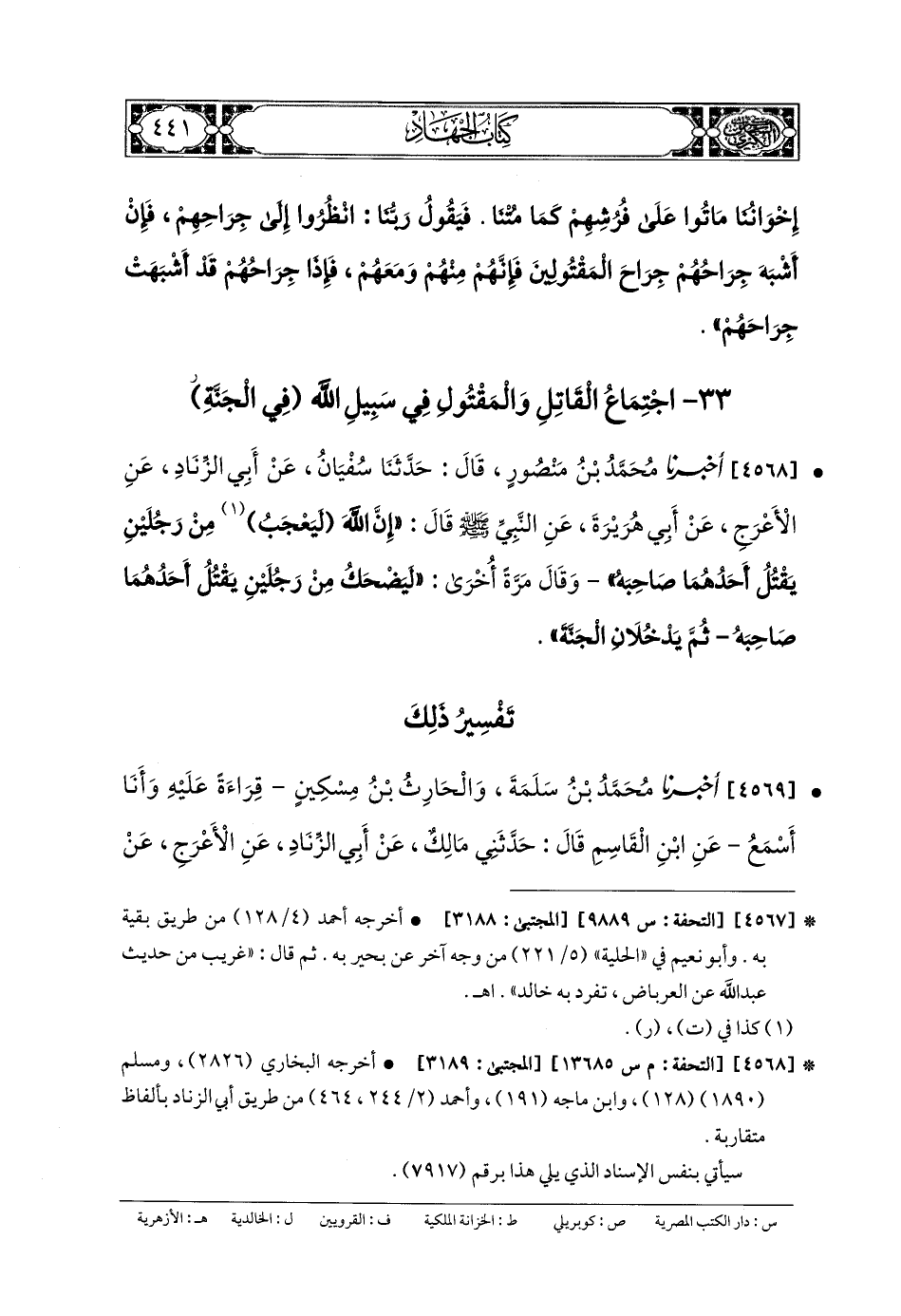 4568- أَخبَرنا مُحَمدُ بنُ مَنْصُورٍ، قَالَ: حَدَّثنا سُفيانُ، عَن أَبي الزِّنَادِ، عَنِ الأَعْرَجِ، عَن أَبي هُرَيرَةَ، عَنِ النَّبيِّ صَلى الله عَليه وسَلم قَالَ: إِنَّ اللهَ ليَعَجَّبُ مِنْ رَجُلَيْنِ يَقْتُلُ أَحَدُهُمَا صَاحِبَهُ، وَقَالَ مَرَّةً أُخْرَى: لَيَضْحَكُ مِنْ رَجُلَيْنِ يَقْتُلُ أَحَدُهُمَا صَاحِبَهُ، ثُمَّ يَدْخُلانِ الجَنَّةَ.