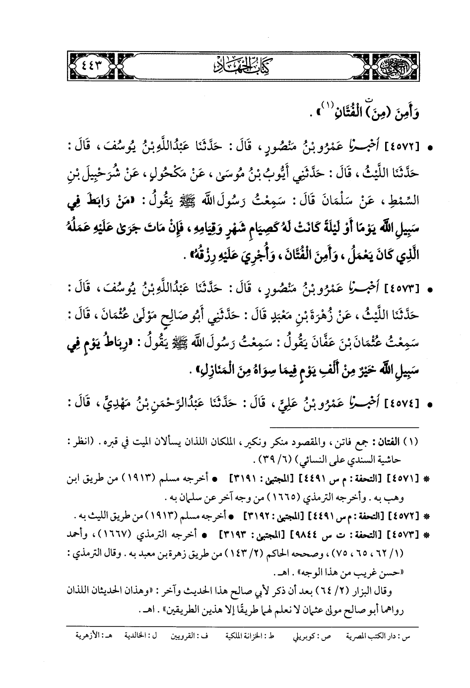 4572- أَخبَرنا عَمرُو بنُ مَنْصُورٍ، قَالَ: حَدَّثنا عَبدُ اللهِ بنُ يُوسُفَ، قَالَ: حَدَّثنا اللَّيْثُ، قَالَ: حَدَّثني أَيوبُ بنُ مُوسَى، عَن مَكْحُولٍ، عَن شُرَحْبِيلِ بنِ السِّمْطِ، عَن سَلْمَانَ، قَالَ: سَمِعْتُ رَسُولَ اللهِ صَلى الله عَليه وسَلم يَقُولُ: مَنْ رَابَطَ فِي سَبِيلِ اللهِ يَوْمًا أَوْ لَيْلَةً كَانَتْ لَهُ كَصِيَامِ شَهْرٍ وَقِيَامِهِ، فَإِنْ مَاتَ جَرَى عَلَيْهِ عَمَلُهُ الَّذِي كَانَ يَعْمَلُ، وَأَمِنَ الفتَّانَ وَأُجْرِيَ عَلَيْهِ رِزْقُهُ.
