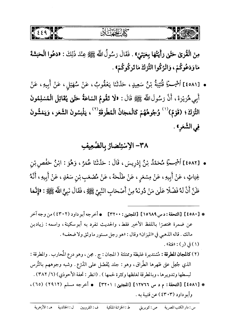 4581- أَخبَرنا قُتَيبَةُ بنُ سَعِيدٍ، حَدَّثنا يَعقُوبُ، عَن سُهَيْلٍ، عَن أَبيهِ، عَن أَبي هُرَيرَةَ، أَنَّ رَسُولَ اللهِ صَلى الله عَليه وسَلم قَالَ: لا تَقُومُ السَّاعَةُ حَتَّى يُقَاتِلَ المُسْلِمُونَ التُّرْكَ، قَوْمٌ وُجُوهُهُمْ كَالمَجَانِّ المُطْرَقَةِ يَلْبَسُونَ الشَّعْرَ، وَيَمْشُونَ فِي الشَّعْرِ.