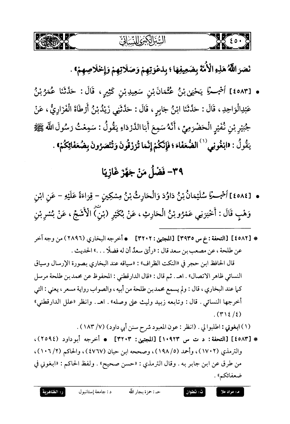 4583- أَخبَرنا يَحيَى بنُ عُثْمَانَ بنِ سَعِيدِ بنِ كَثِيرٍ، قَالَ: حَدَّثنا عُمَرُ بنُ عَبدِ الوَاحِدِ، قَالَ: حَدَّثنا ابْنُ جَابِرٍ، قَالَ: حَدَّثنا زَيْدُ بنُ أَرْطَاةَ الفَزَارِيُّ، عَن جُبَيرِ بنِ نُفَيْرٍ الحَضْرَمِيِّ، أَنَّهُ سَمِعَ أَبَا الدَّرْدَاءِ يَقُولُ: سَمِعْتُ رَسُولَ اللهِ صَلى الله عَليه وسَلم يَقُولُ: ابْغُونِي الضُّعَفَاءَ، فَإِنَّكُمْ إِنَّمَا تُرْزَقُونَ وَتُنْصَرُونَ بِضُعَفَائِكُمْ.
