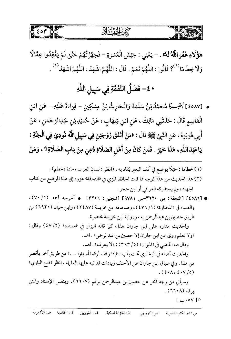 4587- أَخبَرنا مُحَمدُ بنُ سَلَمَةَ، وَالحَارِثُ بنُ مِسْكِينٍ، قِرَاءَةً عَلَيْهِ، عَنِ ابنِ القَاسِمِ، قَالَ: حَدَّثني مَالِكٌ، عَنِ ابنِ شِهَابٍ، عَن حُمَيْدِ بنِ عَبدِ الرَّحمَنِ، عَن أَبي هُرَيرَةَ، أَنَّ النَّبيِّ صَلى الله عَليه وسَلم قَالَ: مَنْ أَنْفَقَ زَوْجَيْنِ فِي سَبِيلِ اللهِ نُودِيَ فِي الجَنَّةِ يَا عَبدَ اللهِ هَذَا خَيْرٌ، فَمَنْ كَانَ مِنْ أَهْلِ الصَّلاةِ، دُعِيَ مِنْ بَابِ الصَّلاةِ، وَمَنْ كَانَ مِنْ أَهْلِ الجِهَادِ، دُعِيَ مِنْ بَابِ الجِهَادِ، وَمَنْ كَانَ مِنْ أَهْلِ الصَّدَقَةِ، دُعِيَ مِنْ بَابِ الصَّدَقَةِ، وَمَنْ كَانَ مِنْ أَهْلِ الصِّيَامِ، دُعِيَ مِنْ بَابِ الرَّيَّانِ، فَقَالَ أَبو بَكْرٍ: هَلْ عَلَى مَنْ يُدْعَى مِنْ هَذِهِ الأَبْوَابِ كُلِّهَا مِنْ ضَرُورَةٍ فَهَلْ يُدْعَى أَحَدٌ مِنْ هَذِهِ الأَبْوَابِ كُلِّهَا؟ قَالَ: نَعَمْ، وَأَرْجُو أَنْ تَكُونَ مِنْهُمْ.