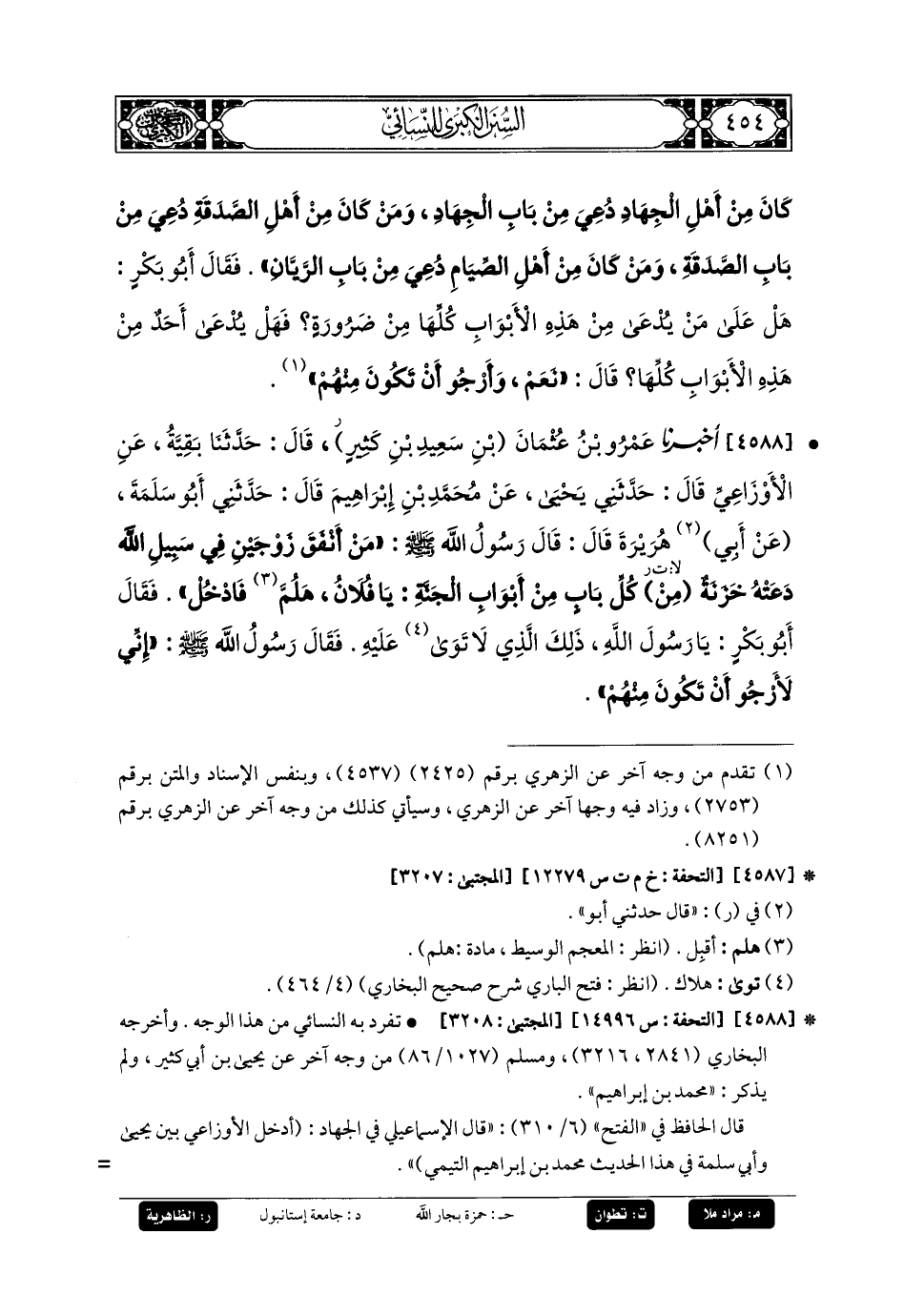 4588- أَخبَرنا عَمرُو بنُ عُثْمَانَ بنِ سَعِيدِ بنِ كَثِيرٍ، قَالَ: حَدَّثنا بَقِيَّةُ، عَنِ الأَوْزَاعِيِّ، قَالَ: حَدَّثني يَحيَى، عَن مُحَمدِ بنِ إِبرَاهِيمَ، قَالَ: حَدَّثني أَبو سَلَمَةَ، عن أَبو هُرَيرَةَ قَالَ: قَالَ رَسُولُ اللهِ صَلى الله عَليه وسَلم: مَنْ أَنْفَقَ زَوْجَيْنِ فِي سَبِيلِ اللهِ دَعَتْهُ خَزَنَةُ من كُلِّ بَابٍ مِنْ أَبْوَابِ الجَنَّةِ: يَا فُلانُ هَلُمَّ فَادْخُلْ، فَقَالَ أَبو بَكْرٍ: يَا رَسُولَ اللهِ، ذَلِكَ الَّذِي لا تَوَى عَلَيْهِ، فَقَالَ رَسُولُ اللهِ صَلى الله عَليه وسَلم: إِنِّي لأَرْجُو أَنْ تَكُونَ مِنْهُمْ.
