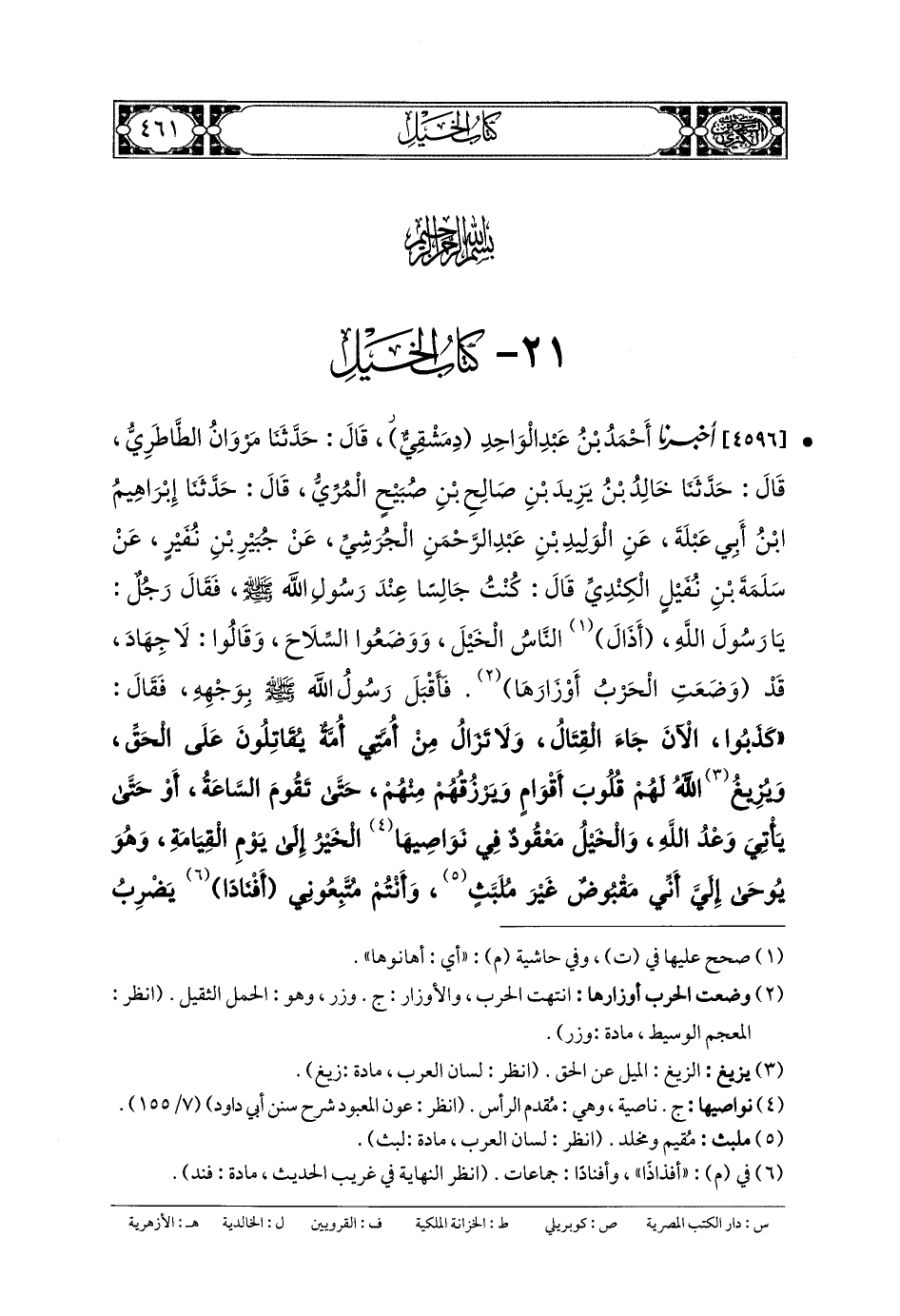 4596 - أَخبَرنا أَحْمَدُ بنُ عَبدِ الوَاحِدِ، دِمَشْقِيٌّ، قَالَ: حَدَّثنا مَرْوَانُ الطَّاطَرِيُّ، قَالَ: حَدَّثنا خَالِدُ بنُ يَزِيدَ بنِ صَالِحِ بنِ صُبَيْحٍ المُرِّيِّ، قَالَ: حَدَّثنا إِبرَاهِيمُ بنُ أَبي عَبْلَةَ، عَنِ الوَلِيدِ بنِ عَبدِ الرَّحمَنِ الجُرَشِيِّ، عَن جُبَيرِ بنِ نُفَيْرٍ، عَن سَلَمَةَ بنِ نُفَيْلٍ الكِنْدِيِّ قَالَ: كُنْتُ جَالِسًا عِنْدَ رَسُولِ اللهِ صَلى الله عَليه وسَلم، فَقَالَ رَجُلٌ: يَا رَسُولَ اللهِ، أَذَالَ النَّاسُ الخَيْلَ، وَوَضَعُوا السِّلاحَ، وَقَالُوا: لا جِهَادَ، قَدْ وَضَعَتِ الحَرْبُ أَوْزَارَهَا، فَأَقْبَلَ رَسُولُ اللهِ صَلى الله عَليه وسَلم بِوَجْهِهِ فَقَالَ: كَذَبُوا الآنَ جَاءَ القِتَالُ، وَلا تزَالُ مِنْ أُمَّتِي أَمَةٌ يُقَاتِلُونَ عَلَى الحَقِّ، وَيُزِيغُ اللهُ لَهُمْ قُلُوبَ أَقْوَامٍ، وَيَرْزُقُهُمْ مِنْهُمْ حَتَّى تَقُومَ السَّاعَةُ، أَوْ حَتَّى يَأْتِيَ وَعْدُ اللهِ، وَالخَيْلُ مَعْقُودٌ فِي نَوَاصِيهَا الخَيْرُ إِلَى يَوْمِ القِيَامَةِ، وَهُوَ يُوحَى إِلَيَّ أَنِّي مَقْبُوضٌ غَيْرُ مُلَبَّثٍ، وَأَنْتُمْ مُتَّبِعُونِي أَفْنَادًا يَضْرِبُ بَعْضُكُمْ رِقَابَ بَعْضٍ، وَعُقْرُ دَارِ المُؤْمِنِينَ الشَّامُ.