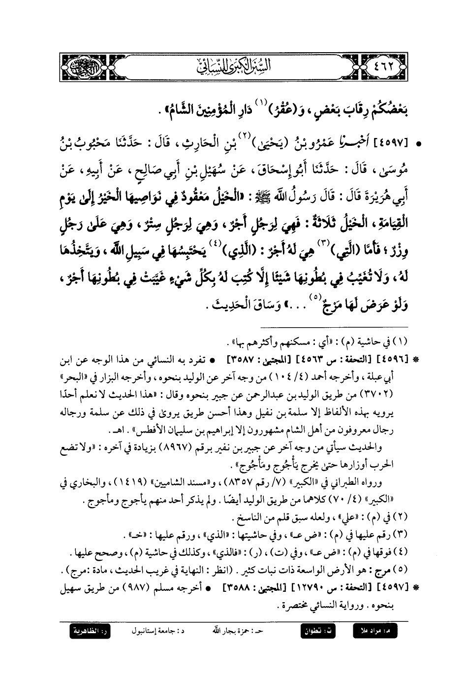 4597- أَخبَرنا عَمرُو بنُ يَحيَى بنِ الحَارِثِ، قَالَ: حَدَّثنا مَحْبُوبُ بنُ مُوسَى، قَالَ: حَدَّثنا أَبو إِسحَاقَ، عَن سُهَيْلِ بنِ أَبي صَالِحٍ، عَن أَبيهِ، عَن أَبي هُرَيرَةَ قَالَ: قَالَ رَسُولُ اللهِ صَلى الله عَليه وسَلم: الخَيْلُ مَعْقُودٌ فِي نَوَاصِيهَا الخَيْرُ إِلَى يَوْمِ القِيَامَةِ، الخَيْلُ ثَلاثَةٌ: فَهِيَ لِرَجُلٍ أَجْرٌ، وَهِيَ لِرَجُلٍ سِتْرٌ، وَهِيَ عَلَى رَجُلٍ وِزْرٌ، فَأَمَّا الَّتِي هِيَ لَهُ أَجْرٌ، الَّذِي يَحْتَبِسُهَا فِي سَبِيلِ اللهِ، وَيَتَّخِذُهَا لَهُ، وَلا تُغَيِّبُ فِي بُطُونِهَا شَيْئًا إِلاَّ كُتِبَ لَهُ بِكُلِّ شَيْءٍ غُيِّبَتْ فِي بُطُونِهَا أَجْرٌ، وَلَوْ عَرَضَ لَهَا مَرْجٌ ... وَسَاقَ الحَدِيثَ.