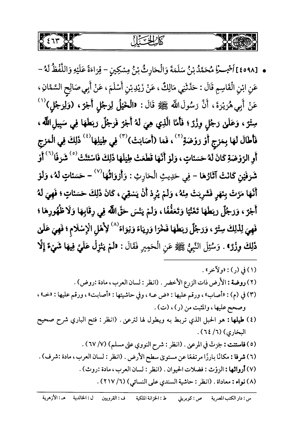 4598- أَخبَرنا مُحَمدُ بنُ سَلَمَةَ، وَالحَارِثُ بنُ مِسْكِينٍ، قِرَاءَةً عَلَيْهِ، وَاللَّفْظُ لَهُ، عَنِ ابنِ القَاسِمِ، قَالَ: حَدَّثني مَالِكٌ، عَن زَيْدِ بنِ أَسْلَمَ، عَن أَبي صَالِحٍ السَّمَّانِ، عَن أَبي هُرَيرَةَ، أَنَّ رَسُولَ اللهِ صَلى الله عَليه وسَلم قَالَ: الخَيْلُ لِرَجُلٍ أَجْرٌ، وَلِرَجُلٍ سِتْرٌ، وَعَلَى رَجُلٍ وِزْرٌ، فَأَمَّا الَّذِي هِيَ لَهُ أَجْرٌ، فَرَجُلٌ رَبَطَهَا فِي سَبِيلِ اللهِ، فَأَطَالَ لَهَا بِمَرْجٍ أَوْ رَوْضَةٍ فَمَا أَصَابَتْ فِي طِيَلَهَا ذَلِكَ في المَرْجِ أَوِ الرَّوْضَةِ كَانَ لَهُ حَسَنَاتٍ، وَلَوْ أَنَّهَا قَطَعَتْ طِيَلَهَا ذَلِكَ فَاسْتَنَّتْ شَرَفًا أَوْ شَرَفَيْنِ كَانَتْ آثَارُهَا، فِي حَدِيثِ الحَارِثِ: وَأَرْوَاثُهَا حَسَنَاتٍ لَهُ، وَلَوْ أَنَّهَا مَرَّتْ بِنَهْرٍ فَشَرِبَتْ مِنْهُ، وَلَمْ يُرِدْ أَنْ يَسْقِيَ كَانَ ذَلِكَ حَسَنَاتٍ فَهِيَ لَهُ أَجْرٌ، وَرَجُلٌ رَبَطَهَا تَغَنِّيًا وَتَعَفُّفًا وَلَمْ يَنْسَ حَقَّ اللهِ فِي رِقَابِهَا، وَلا ظُهُورِهَا فَهِيَ لِذَلِكَ سِتْرٌ، وَرَجُلٌ رَبَطَهَا فَخْرًا وَرِيَاءً وَنِوَاءً لأَهْلِ الإِسلامِ، فَهِيَ عَلَى ذَلِكَ وِزْرٌ، وَسُئِلَ النَّبيُّ صَلى الله عَليه وسَلم عَنِ الحَمِيرِ، فَقَالَ: لَمْ يَنْزِلْ عَلَيَّ فِيهَا شَيْءٌ إِلاَّ هَذِهِ الآيَةُ الجَامِعَةُ الفَاذَّةُ: {فَمَنْ يَعْمَلْ مِثْقَالَ ذَرَّةٍ خَيْرًا يَرَهُ وَمَنْ يَعْمَلْ مِثْقَالَ ذَرَّةٍ شَرًّا يَرَهُ}.