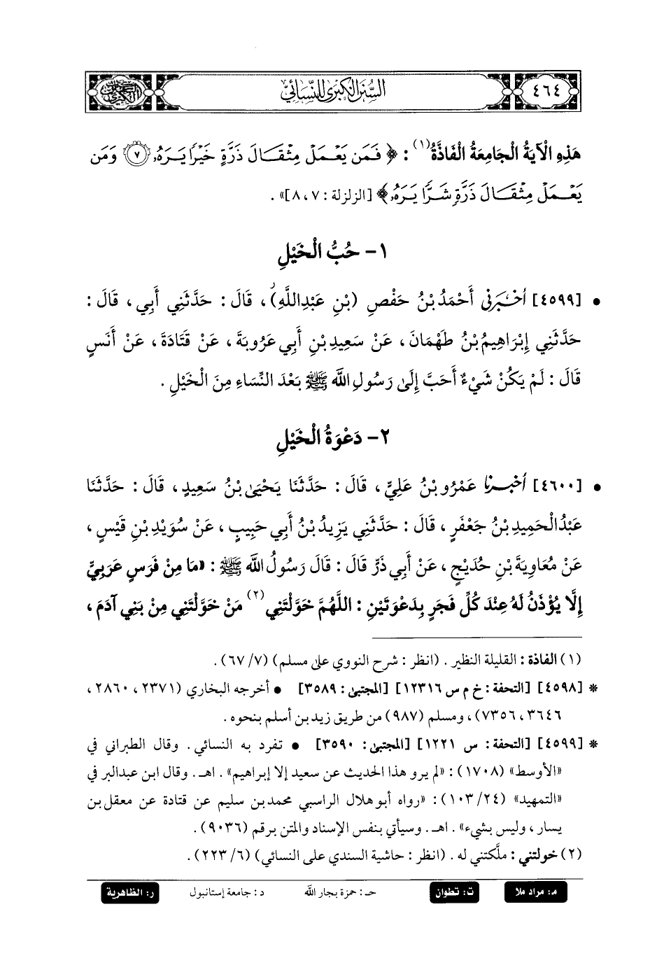 4600- أَخبَرنا عَمرُو بنُ عَليٍّ، قَالَ: حَدَّثنا يَحيَى بنُ سَعِيدٍ، قَالَ: حَدَّثنا عَبدُ الحَمِيدِ بنُ جَعفَرٍ، قَالَ: حَدَّثني يَزِيدُ بنُ أَبي حَبِيبٍ، عَن سُوَيْدِ بنِ قَيسٍ، عَن مُعاويَةَ بنِ حُدَيْجٍ، عَن أَبي ذَرٍّ قَالَ: قَالَ رَسُولُ اللهِ صَلى الله عَليه وسَلم: مَا مِنْ فَرَسٍ عَرَبِيٍّ إِلاَّ يُؤْذَنُ لَهُ عِنْدَ كُلِّ فَجْرٍ بِدَعْوَتَيْنِ، اللهُمَّ خَوَّلْتَنِي مَنْ خَوَّلْتَنِي مِنْ بَنِي آدَمَ، وَجَعَلْتَنِي لَهُ، فَاجْعَلْنِي أَحَبَّ أَهْلِهِ وَمَالِهِ إِلَيْهِ، أَوْ مِنْ أَحَبِّ أَهْلِهِ وَمَالِهِ إِلَيْهِ.