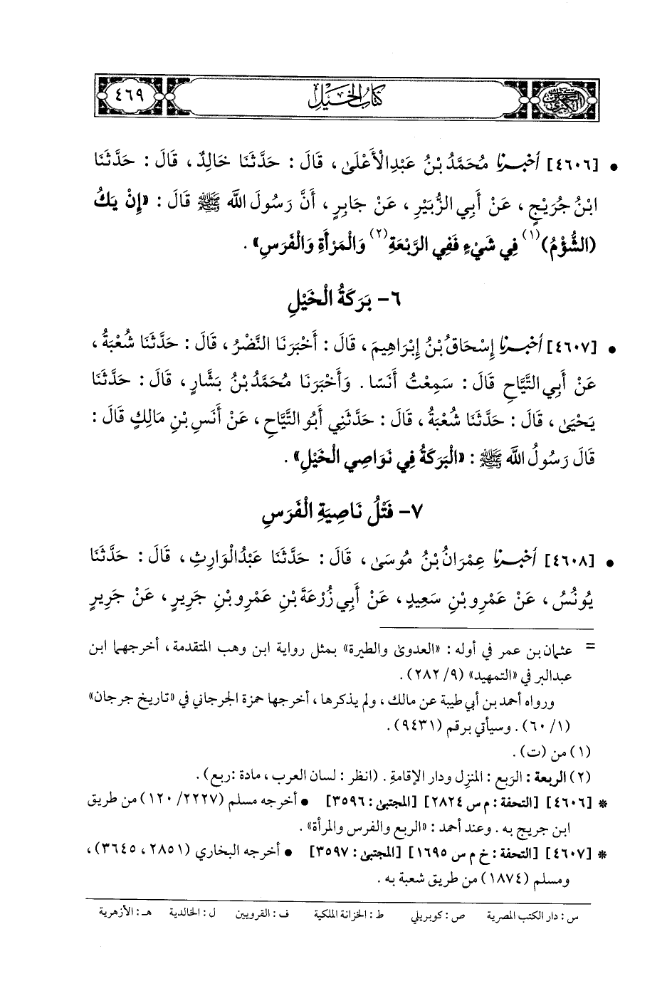 4608- أَخبَرنا عِمْرَانُ بنُ مُوسَى، قَالَ: حَدَّثنا عَبدُ الوَارِثِ، قَالَ: حَدَّثنا يُونُسُ، عَن عَمْرِو بنِ سَعِيدٍ، عَن أَبي زُرْعَةَ بنِ عَمْرِو بنِ جَرِيرٍ، عَن جَرِيرٍ قَالَ: رَأَيْتُ رَسُولَ اللهِ صَلى الله عَليه وسَلم يَفْتِلُ نَاصِيَةَ فَرَسٍ بَيْنَ إِصْبُعَيْهِ وَيَقُولُ: الخَيْلُ مَعْقُودٌ فِي نَوَاصِيهَا الخَيْرُ إِلَى يَوْمِ القِيَامَةِ، الأَجْرُ وَالغَنِيمَةُ.