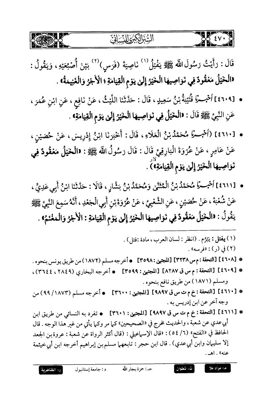 4609- أَخبَرنا قُتَيبَةُ بنُ سَعِيدٍ، قَالَ: حَدَّثنا اللَّيْثُ، عَن نَافِعٍ، عَنِ ابنِ عُمَرَ، عَنِ النَّبيِّ صَلى الله عَليه وسَلم قَالَ: الخَيْلُ فِي نَوَاصِيهَا الخَيْرُ إِلَى يَوْمِ القِيَامَةِ.