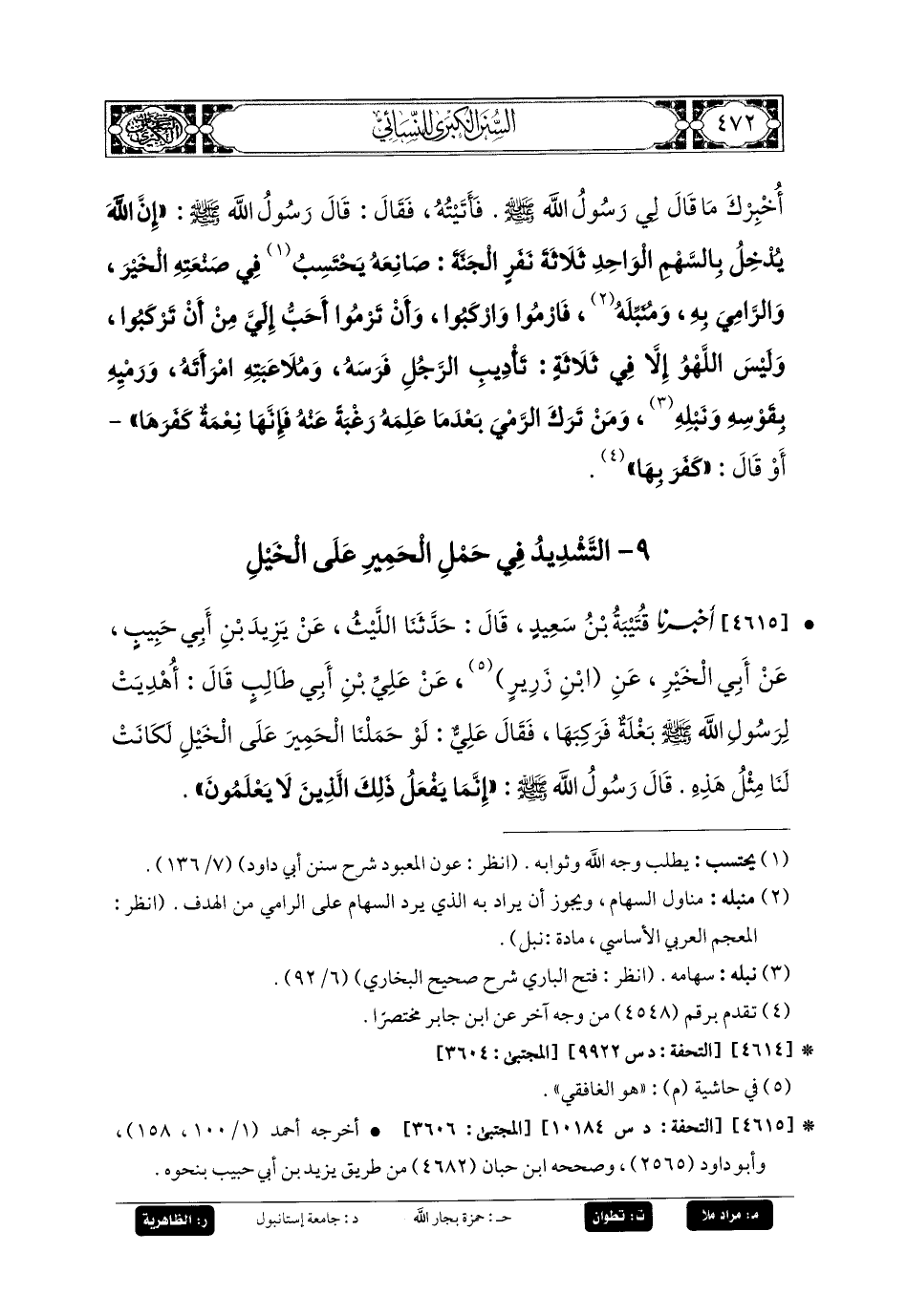 4615- أَخبَرنا قُتَيبَةُ بنُ سَعِيدٍ، قَالَ: حَدَّثنا اللَّيْثُ، عَن يَزِيدَ بنِ أَبي حَبِيبٍ، عَن أَبي الخَيْرِ، عَنِ ابنِ زَريْرٍ، عَن عَليِّ بنِ أَبي طَالِبٍ قَالَ: أُهْدِيَتْ لِرَسُولِ اللهِ صَلى الله عَليه وسَلم بَغْلَةٌ فَرَكِبَهَا، فَقَالَ عَليٌّ: لَوْ حَمَلْنَا الحَمِيرَ عَلَى الخَيْلِ لَكَانَتْ لَنَا مِثْلُ هَذِهِ، قَالَ رَسُولُ اللهِ صَلى الله عَليه وسَلم: إِنَّمَا يَفْعَلُ ذَلِكَ الَّذِينَ لا يَعْلَمُونَ.