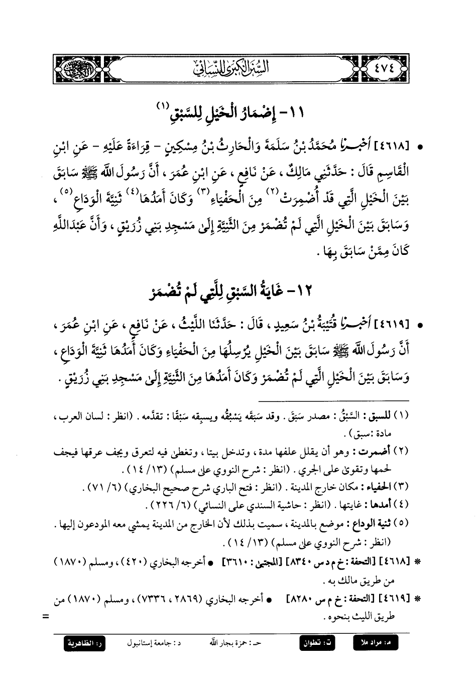 4619- أَخبَرنا قُتَيبَةُ بنُ سَعِيدٍ، قَالَ: حَدَّثنا اللَّيْثُ، عَن نَافِعٍ، عَنِ ابنِ عُمَرَ، أَنَّ رَسُولَ اللهِ صَلى الله عَليه وسَلم سَابَقَ الخَيْلَ يُرْسِلُهَا مِنَ الحَفْيَاءِ، وَكَانَ أَمَدُهَا ثَنِيَّةَ الوَدَاعِ، وَسَابَقَ بَيْنَ الخَيْلِ الَّتِي لَمْ تُضَمَّرْ، وَكَانَ أَمَدُهَا مِنَ الثَّنِيَّةِ إِلَى مَسْجِدِ بَنِي زُرَيْقٍ.