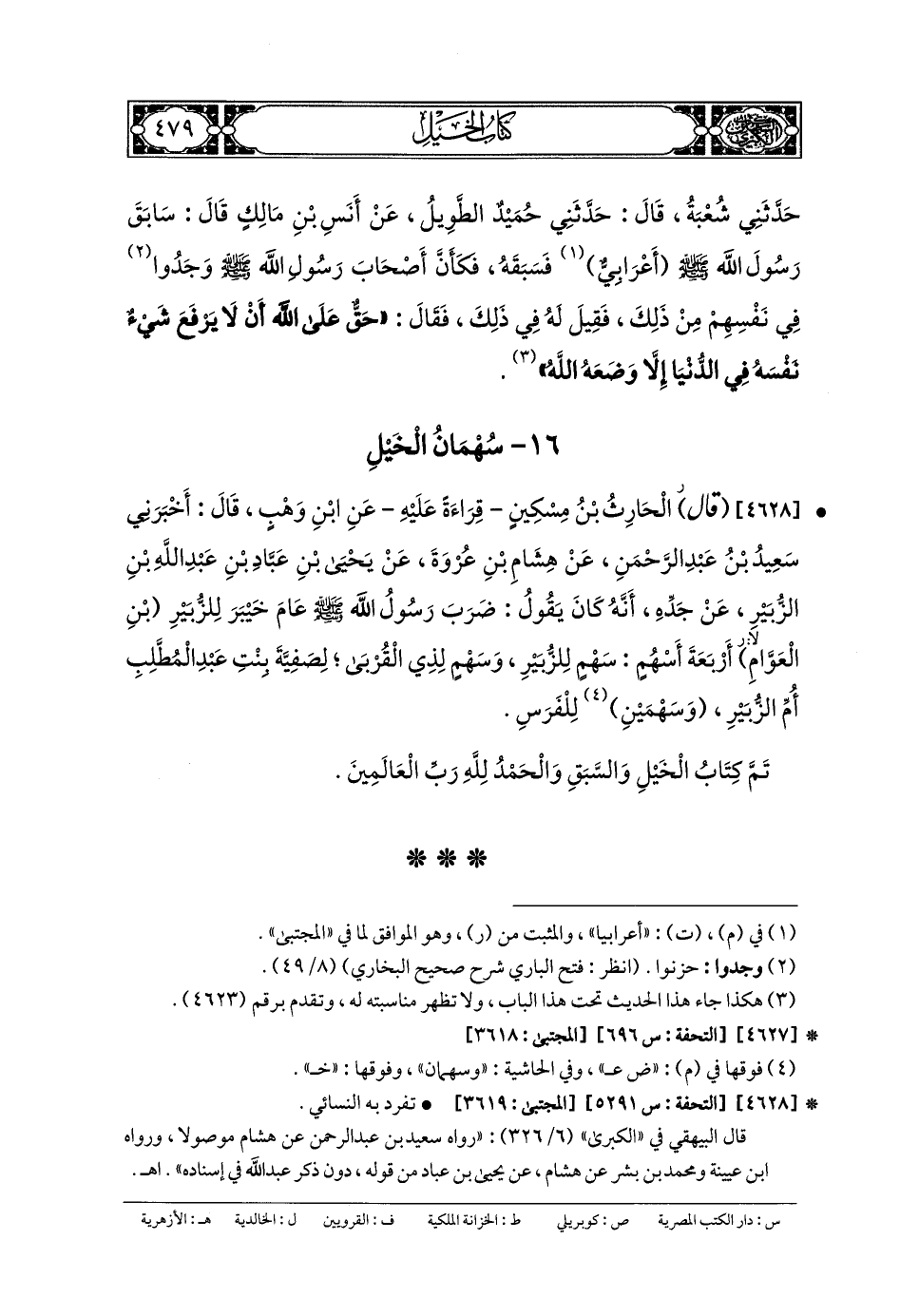 4628- قال الحَارِثُ بنُ مِسْكِينٍ، قِرَاءَةً عَلَيْهِ، عَنِ ابنِ وَهْبٍ، قَالَ: أَخبَرني سَعِيدُ بنُ عَبدِ الرَّحمَنِ، عَن هِشَامِ بنِ عُرْوَةَ، عَن يَحيَى بنِ عَبَّادِ بنِ عَبدِ اللهِ بنِ الزُّبَيْرِ، عَن جَدِّهِ، أَنَّهُ كَانَ يَقُولُ: ضَرَبَ رَسُولُ اللهِ صَلى الله عَليه وسَلم عَامَ خَيْبَرَ لِلزُّبَيْرِ بنِ العَوَّامِ أَرْبَعَةَ أَسْهُمٍ؛ سَهْمٌ لِلزُّبَيْرِ، وَسَهْمٌ لِذِي القُرْبَى لِصَفِيَّةَ بِنْتِ عَبدِ المُطَّلِبِ أُمِّ الزُّبَيْرِ، وَسَهْمَينِ لِلْفَرَسِ.