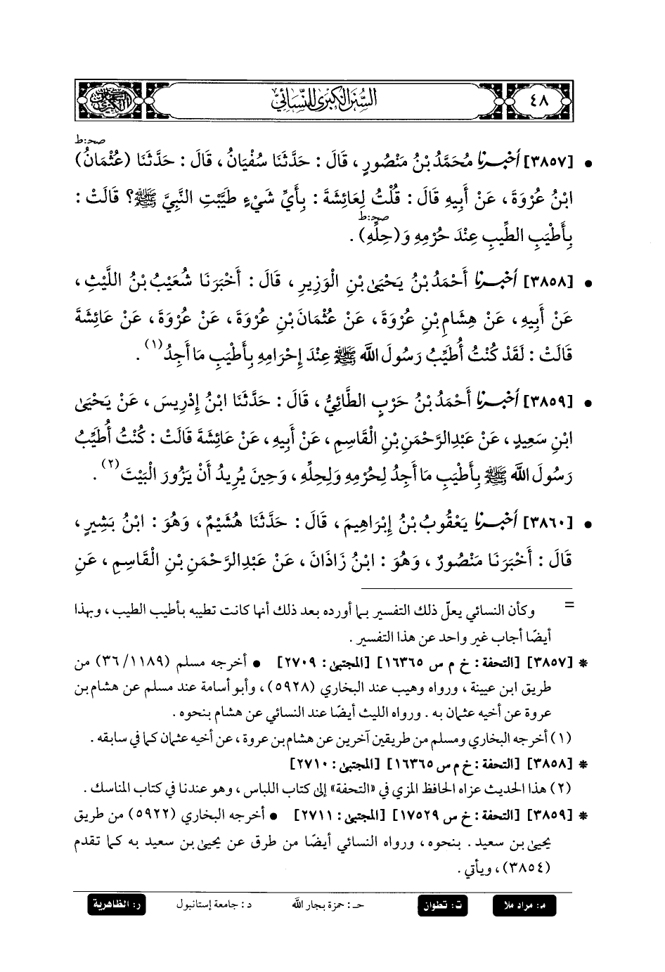 3859- أَخبَرنا أَحْمَدُ بنُ حَرْبٍ الطَّائِيُّ، قَالَ: حَدَّثنا ابْنُ إِدرِيسَ، عَن يَحيَى بنِ سَعِيدٍ، عَن عَبدِ الرَّحمَنِ بنِ القَاسِمِ، عَن أَبيهِ، عَن عَائِشَةَ، قَالَتْ: كُنْتُ أُطَيِّبُ رَسُولَ اللهِ صَلى الله عَليه وسَلم بِأَطْيَبِ مَا أَجِدُ لِحُرْمِهِ وَلِحِلِّهِ، وَحِينَ يُرِيدُ أَنْ يَزُورَ البَيْتَ.
