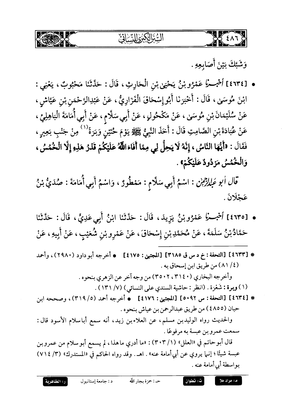 4634- أَخبَرنا عَمرُو بنُ يَحيَى بنِ الحَارِثِ، قَالَ: حَدَّثنا مَحْبُوبٌ، يَعْنِي ابْنَ مُوسَى، قَالَ: أَخبَرنا أَبو إِسحَاقَ الفَزَارِيُّ، عَن عَبدِ الرَّحمَنِ بنِ عَيَّاشٍ، عَن سُلَيمَانَ بنِ مُوسَى، عَن مَكْحُولٍ، عَن أَبي سَلامٍ، عَن أَبي أُمَامَةَ البَاهِلِيِّ، عَن عُبَادَةَ بنِ الصَّامِتِ قَالَ: أَخَذَ النَّبيُّ صَلى الله عَليه وسَلم يَوْمَ حُنَيْنٍ وَبَرَةً مِنْ جَنْبِ بَعِيرٍ، فَقَالَ: أَيُّهَا النَّاسُ إِنَّهُ لا يَحِلُّ لِي مِمَّا أَفَاءَ اللهُ عَلَيْكُمْ قَدْرُ هَذِهِ إِلاَّ الخُمُسُ، وَالخُمُسُ مَرْدُودٌ عَلَيْكُمْ.
