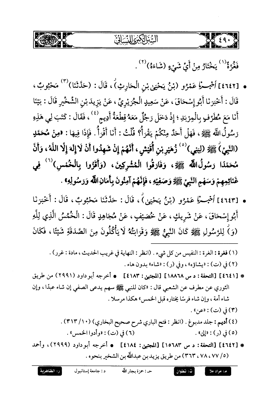 4642- أَخبَرنا عَمرُو بنُ يَحيَى بنِ الحَارِثِ، قَالَ: حَدَّثنا مَحْبُوبٌ، قَالَ: أَخبَرنا أَبو إِسحَاقَ، عَن سَعِيدٍ الجُرَيْرِيِّ، عَن يَزِيدَ بنِ الشِّخِّيرِ قَالَ: بَيْنَا أَنَا مَعَ مُطَرِّفٍ بِالمِرْبَدِ إِذْ دَخَلَ رَجُلٌ مَعَهُ قِطْعَةُ أَدِيمٍ فَقَالَ: كَتَبَ لِي هَذِهِ رَسُولُ اللهِ صَلى الله عَليه وسَلم فَهَلْ أَحَدٌ مِنْكُمْ يَقْرَأُ؟ قَالَ: قُلْتُ: أَنَا أَقْرَأُ، فَإِذَا فِيهَا: مِنْ مُحَمدٍ النَّبيِّ صَلى الله عَليه وسَلم لِبَنِي زُهَيْرِ بنِ أُقَيْشَ، أَنَّهُمْ إِنْ شَهِدُوا أَنَّ لا إِلَهَ إِلاَّ اللهُ، وَأَنَّ مُحَمدًا رَسُولُ اللهِ، وَفَارَقُوا المُشْرِكِينَ، وَأَقَرُّوا بالخُمُسِ فِي غَنَائِمِهِمْ، وَسَهْمِ النَّبيِّ صَلى الله عَليه وسَلم وَصَفِيِّهِ فَإِنَّهُمْ آمِنُونَ بِأَمَانِ اللهِ وَرَسُولِهِ.