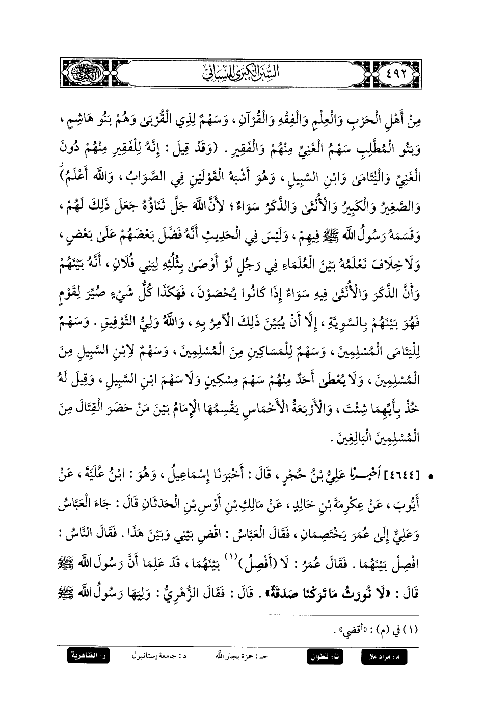 4644- أَخبَرنا عَليُّ بنُ حُجْرٍ، قَالَ: أَخبَرنا إِسمَاعِيلُ، وَهُوَ ابْنُ عُلَيَّةَ، عَن أَيوبَ، عَن عِكْرِمَةَ بنِ خَالِدٍ، عَن مَالِكِ بنِ أَوْسِ بنِ الحَدَثَانِ، قَالَ: جَاءَ العَبَّاسُ وَعَليٌّ إِلَى عُمَرَ يَخْتَصِمَانِ، فَقَالَ العَبَّاسُ: اقْضِ بَيْنِي وَبَيْنَ هَذَا، فَقَالَ النَّاسُ: افْصِلْ بَيْنَهُمَا، فَقَالَ عُمَرُ: لا أَفْصِلُ بَيْنَهُمَا، قَدْ عَلِمَا أَنَّ رَسُولَ اللهِ صَلى الله عَليه وسَلم قَالَ: لا نُورَثُ، مَا تَرَكْنَا صَدَقَةٌ، قَالَ: فَقَالَ الزُّهْرِيُّ: وَلِيَهَا رَسُولُ اللهِ صَلى الله عَليه وسَلم، فَأَخَذَ مِنْهَا قُوتَ أَهْلِهِ، وَجَعَلَ سَائِرَهُ سَبِيلَهُ سَبِيلَ المَالِ، ثُمَّ وَلِيَهَا أَبو بَكْرٍ بَعْدَهُ، ثُمَّ وُلِّيتُهَا بَعْدَ أَبي بَكْرٍ فَصَنَعْتُ فِيهَا الَّذِي كَانَ يَصْنَعُ، ثُمَّ أَتَيَانِي فَسَأَلانِي أَنْ أَدْفَعَهَا إِلَيْهِمَا عَلَى أَنْ يَلِيَاهَا بِالَّذِي وَلِيَهَا بِهِ رَسُولُ اللهِ صَلى الله عَليه وسَلم، وَالَّذِي وَلِيَهَا بِهِ أَبو بَكْرٍ، وَالَّذِي وُلِّيتُهَا بِهِ، فَدَفَعْتُهَا إِلَيْهِمَا وَأَخَذْتُ عَلَى ذَلِكَ عُهُودَهُمَا، ثُمَّ أَتَيَانِي يَقُولُ هَذَا: اقْسِمْ لِي بِنَصِيبِي مِنَ ابنِ أَخِي، وَيَقُولُ هَذَا: اقْسِمْ لِي بِنَصِيبِي مِنَ امْرَأَتِي، فَإِنْ شَاءَا أَنْ أَدْفَعَهَا إِلَيْهِمَا عَلَى أَنْ يَلِيَاهَا بِالَّذِي وَلِيَهَا بِهِ رَسُولُ اللهِ صَلى الله عَليه وسَلم، وَالَّذِي وَلِيَهَا بِهِ أَبو بَكْرٍ،