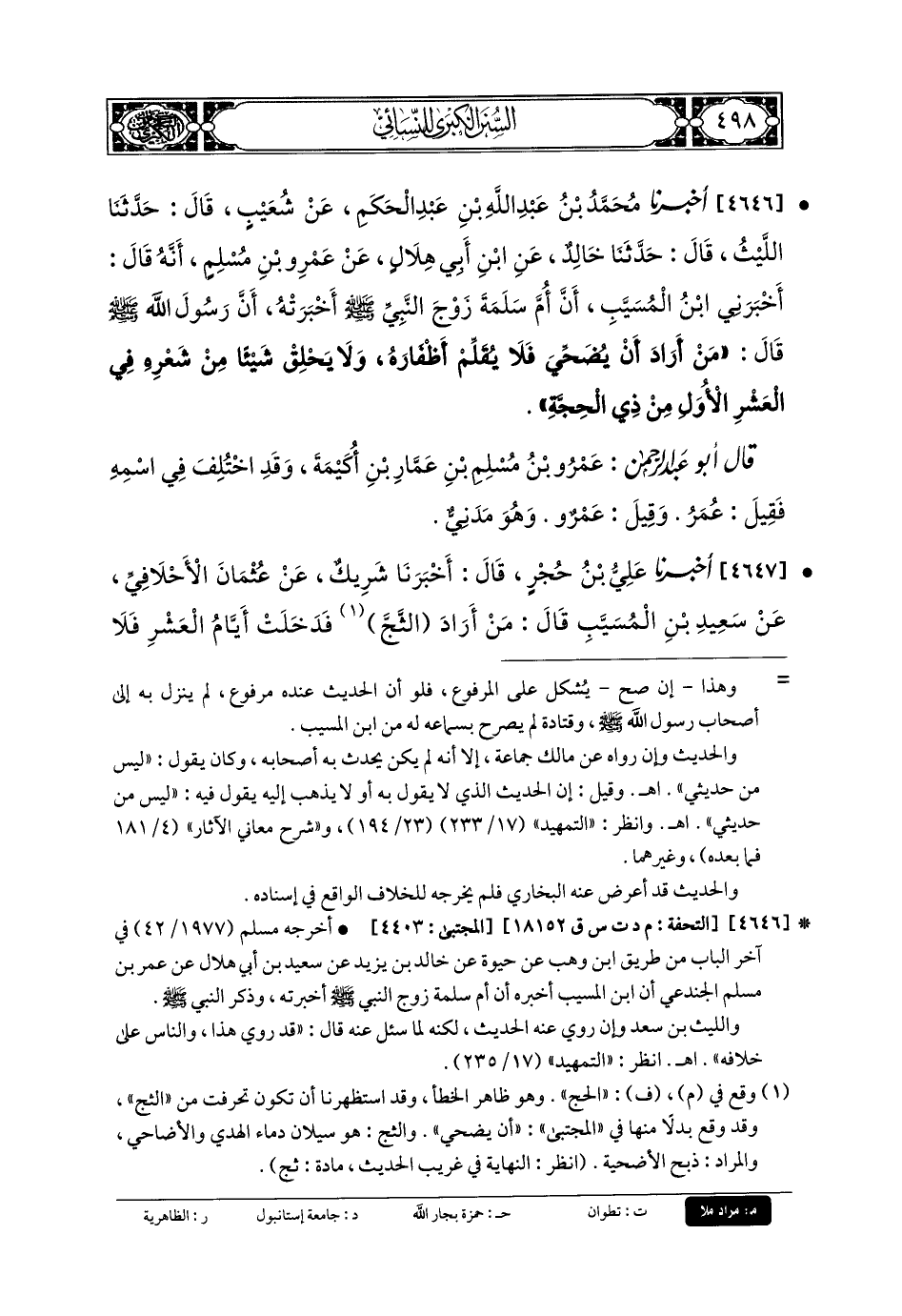 4646- أَخبَرنا مُحَمدُ بنُ عَبدِ اللهِ بنِ الحَكَمِ، عَن شُعَيبٍ، قَالَ: حَدَّثنا اللَّيْثُ، قَالَ: حَدَّثنا خَالِدٌ، عَنِ ابنِ أَبي هِلالٍ، عَن عَمْرِو بنِ مُسْلِمٍ، أَنَّهُ قَالَ: أَخبَرني ابْنُ المُسَيَّبِ، أَنَّ أُمَّ سَلَمَةَ زَوْجَ النَّبيِّ صَلى الله عَليه وسَلم أَخبَرَتْهُ، أَنَّ رَسُولَ اللهِ صَلى الله عَليه وسَلم قَالَ: مَنْ أَرَادَ أَنْ يُضَحِّيَ فَلا يُقَلِّمْ أَظْفَارَهُ، وَلا يَحْلِقْ شَيْئًا مِنْ شَعَرِهِ فِي العَشْرِ الأُوَلِ مِنْ ذِي الحِجَّةِ.