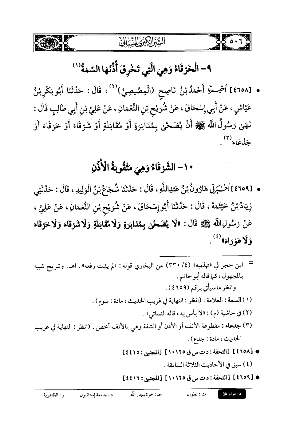 4658- أَخبَرنا أَحْمَدُ بنُ نَاصِحٍ المِصِّيصِيُّ، قَالَ: حَدَّثنا أَبو بَكْرِ بنُ عَيَّاشٍ، عَن أَبي إِسحَاقَ، عَن شُرَيْحِ بنِ النُّعْمَانِ، عَن عَليِّ بنِ أَبي طَالِبٍ قَالَ: نَهَى رَسُولُ اللهِ صَلى الله عَليه وسَلم أَنْ يُضَحِّيَ بِمُدَابَرَةٍ، أَوْ مُقَابَلَةٍ، أَوْ شَرْقَاءَ، أَوْ خَرْقَاءَ، أَوْ جَدْعَاءَ.