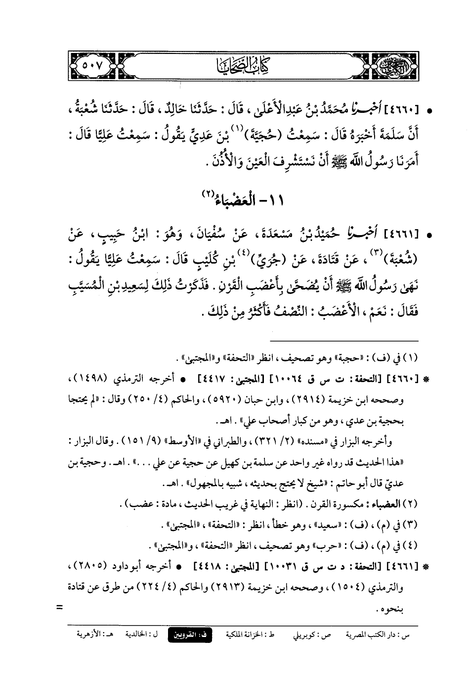 4661- أَخبَرنا حُمَيْدُ بنُ مَسْعَدَةَ، عَن سُفيانَ، وَهُوَ ابْنُ حَبِيبٍ، عَن شُعْبَةَ، عَن قَتَادَةَ، عَن جُرَيِّ بنِ كُلَيْبٍ، قَالَ: سَمِعْتُ عَليًّا يَقُولُ: نَهَى رَسُولُ اللهِ صَلى الله عَليه وسَلم أَنْ يُضَحَّى بِأَعْضَبِ القَرْنِ، فَذَكَرْتُ ذَلِكَ لِسَعِيدِ بنِ المُسَيَّبِ فَقَالَ: نَعَمْ، الأَعْضَبُ النِّصْفُ فَأَكْثَرُ مِنْ ذَلِكَ.