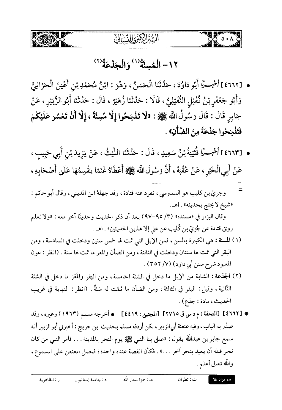4662- أَخبَرنا أَبو دَاوُدَ، حَدَّثنا الحَسَنُ، وَهُوَ ابْنُ مُحَمدِ بنِ أَعْيَنَ الحَرَّانِيُّ، وَأَبو جَعفَرِ بنُ نُفَيْلٍ النُّفَيْلِيَّ، قَالا: حَدَّثنا زُهَيْرٌ، قَالَ: حَدَّثنا أَبو الزُّبَيْرِ، عَن جَابِرٍ قَالَ: قَالَ رَسُولُ اللهِ صَلى الله عَليه وسَلم: لا تَذْبَحُوا إِلاَّ مُسِنَّةً، إِلاَّ أَنْ تعْسُرَ عَلَيْكُمْ فَتَذْبَحُوا جَذَعَةً مِنَ الضَّأْنِ.