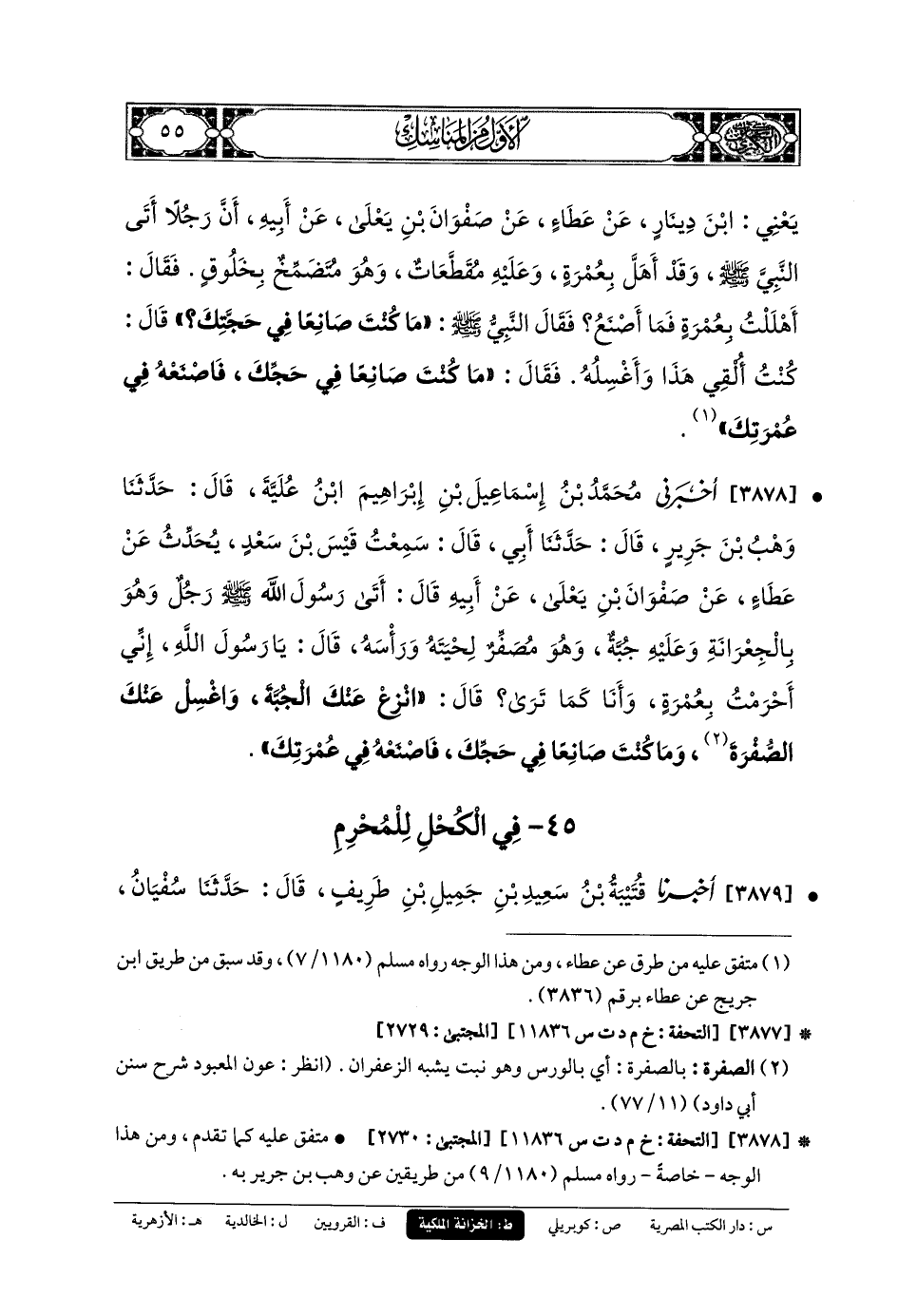 3878- أَخبَرني مُحَمدُ بنُ إِسمَاعِيلَ بنِ إِبرَاهِيمَ ابنِ عُلَيَّةَ، قَالَ: حَدَّثنا وَهْبُ بنُ جَرِيرٍ، قَالَ: حَدَّثنا أَبي، قَالَ: سَمِعْتُ قَيْسَ بْنَ سَعْدٍ يُحَدِّثُ عَن عَطَاءٍ، عَن صَفْوَانَ بنِ يَعْلَى، عَن أَبيهِ، قَالَ: أَتَى رَسُولَ اللهِ صَلى الله عَليه وسَلم رَجُلٌ وَهُوَ بِالجِعْرَانَةِ وَعَلَيْهِ جُبَّةٌ وَهُوَ مُصَفِّرٌ لِحْيَتَهَ وَرَأْسَهُ، قَالَ: يَا رَسُولَ اللهِ، إِنِّي أَحْرَمْتُ بِعُمْرَةٍ، وَأَنَا كَمَا تَرَى، قَالَ: انْزِعْ عَنكَ الجُبَّةَ وَاغْسِلْ عَنكَ الصُّفْرَةَ، وَمَا كُنْتَ صَانِعًا فِي حَجِّكَ فَاصْنَعْهُ فِي عُمْرَتِكَ.