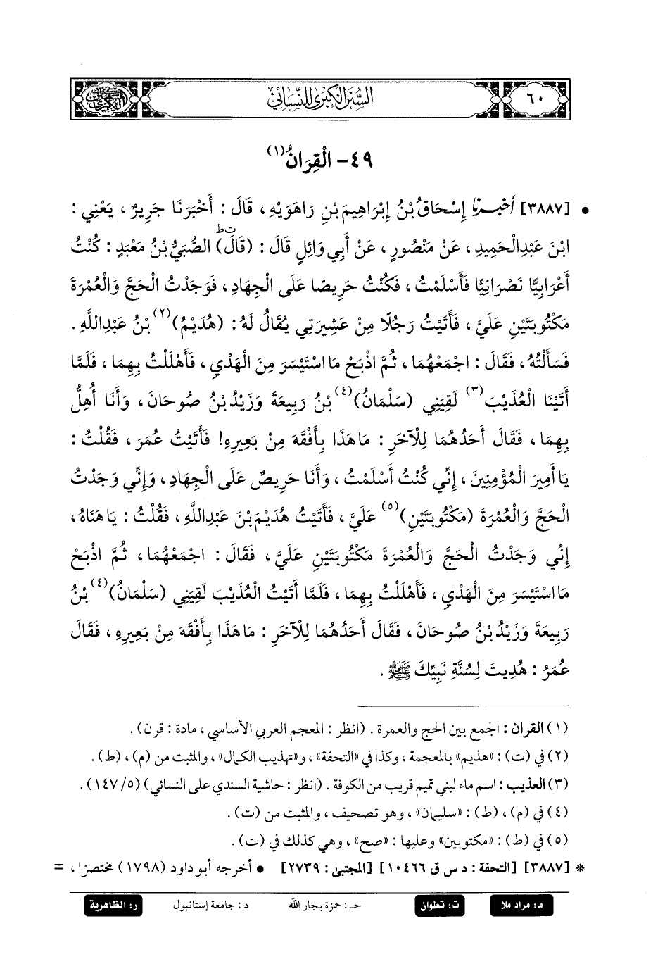 3887- أَخبَرنا إِسحَاقُ بنُ إِبرَاهِيمَ بنِ رَاهَوَيْهِ، قَالَ: أَخبَرنا جَرِيرٌ، يَعْنِي ابْنَ عَبدِ الحَمِيدِ، عَن مَنْصُورٍ، عَن أَبي وَائِلٍ قَالَ: قَالَ الصُّبَيُّ بنُ مَعْبَدٍ: كُنْتُ أَعْرَابِيًّا نَصْرَانِيًّا فَأَسْلَمْتُ، فَكُنْتُ حَرِيصًا عَلَى الجِهَادِ فَوَجَدْتُ الحَجَّ وَالعُمْرَةَ مَكْتُوبَتَيْنِ عَلَيَّ، فَأَتَيْتُ رَجُلاً مِنْ عَشِيرَتِي يُقَالُ لَهُ: هُدَيْمُ بنُ عَبدِ اللهِ، فَسَأَلْتُهُ، فَقَالَ: اجْمَعْهُمَا، ثُمَّ اذْبَحْ مَا اسْتَيْسَرَ مِنَ الهَدْيِ، فَأَهْلَلْتُ بِهِمَا، فَلَمَّا أَتَيْنَا العُذَيْبَ لَقِيَنِي سَلْمَانُ بنُ رَبِيعَةَ، وَزَيْدُ بنُ صُوحَانَ، وَأَنَا أُهِلُّ بِهِمَا، فَقَالَ أَحَدُهُمَا لِلآخَرِ: مَا هَذَا بِأَفْقَهَ مِنْ بَعِيرِهِ، فَأَتَيْتُ عُمَرَ، فَقُلْتُ: يَا أَمِيرَ المُؤْمِنِينَ إِنِّي كُنْتُ أَسْلَمْتُ وَأَنَا حَرِيصٌ عَلَى الجِهَادِ، وَإِنِّي وَجَدْتُ الحَجَّ وَالعُمْرَةَ مَكْتُوبَتَيْنِ عَلَيَّ، فَأَتَيْتُ هُدَيْمَ بْنَ عَبدِ اللهِ، فَقُلْتُ: يَا هَنَاهْ، إِنِّي وَجَدْتُ الحَجَّ وَالعُمْرَةَ مَكْتُوبَتَيْنِ عَلَيَّ، فَقَالَ اجْمَعْهُمَا، ثُمَّ اذْبَحْ مَا اسْتَيْسَرَ مِنَ الهَدْيِ، فَأَهْلَلْتُ بِهِمَا، فَلَمَّا أَتَيْتُ العُذَيْبَ لَقِيَنِي سَلْمَانَ بْنَ رَبِيعَةَ، وَزَيْدَ بْنَ صُوحَانَ، فَقَالَ أَحَدُهُمَا لِلآخَرِ: مَا هَذَا بِأَفْقَهَ مِنْ بَعِيرِهِ، فَقَالَ عُمَرُ: هُدِيتَ لِسُنَّةِ نَبِيِّكَ صَلى الله عَليه وسَلم.