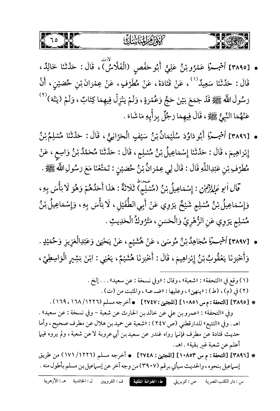 3895 - أَخبَرنا عَمرُو بنُ عَليٍّ أَبو حَفْصٍ الفَلاَّسُ، قَالَ: حَدَّثنا خَالِدٌ، قَالَ: حَدَّثنا سَعِيدٌ، عَن قَتَادَةَ، عَن مُطَرِّفٍ، عَن عِمْرَانَ بنِ حُصَيْنٍ، أَنَّ رَسُولَ اللهِ صَلى الله عَليه وسَلم قَدْ جَمَعَ بَيْنَ حَجٍّ وَعُمْرَةٍ، وَلَمْ يَنْزِلْ فِيهِمَا كِتَابٌ، وَلَمْ يَنْهَ عَنهُمَا النَّبيُّ صَلى الله عَليه وسَلم، قَالَ فِيهِمَا رَجُلٌ بِرَأْيِهِ مَا شَاءَ.