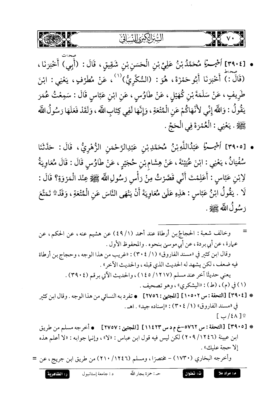 3904 - أَخبَرنا مُحَمدُ بنُ عَليِّ بنِ الحَسَنِ بنِ شَقِيقٍ، قَالَ أَبي: أَخبَرنا، قَالَ: أَخبَرنا أَبو حَمْزَةَ، هُوَ السُّكَّرِيُّ، عَن مُطَرِّفٍ، يَعْنِي ابْنَ طَرِيفٍ، عَن سَلَمَةَ بنِ كُهَيْلٍ، عَن طَاوُوسٍ، عَنِ ابنِ عَبَّاسٍ، قَالَ: سَمِعْتُ عُمَرَ، يَقُولُ: وَاللهِ إِنِّي لأَنْهَاكُمْ عَنِ المُتْعَةِ، وَإِنَّهَا لَفِي كِتَابِ اللهِ، وَلَقَدْ فَعَلَهَا رَسُولُ اللهِ صَلى الله عَليه وسَلم، يَعْنِي العُمْرَةَ فِي الحَجِّ.