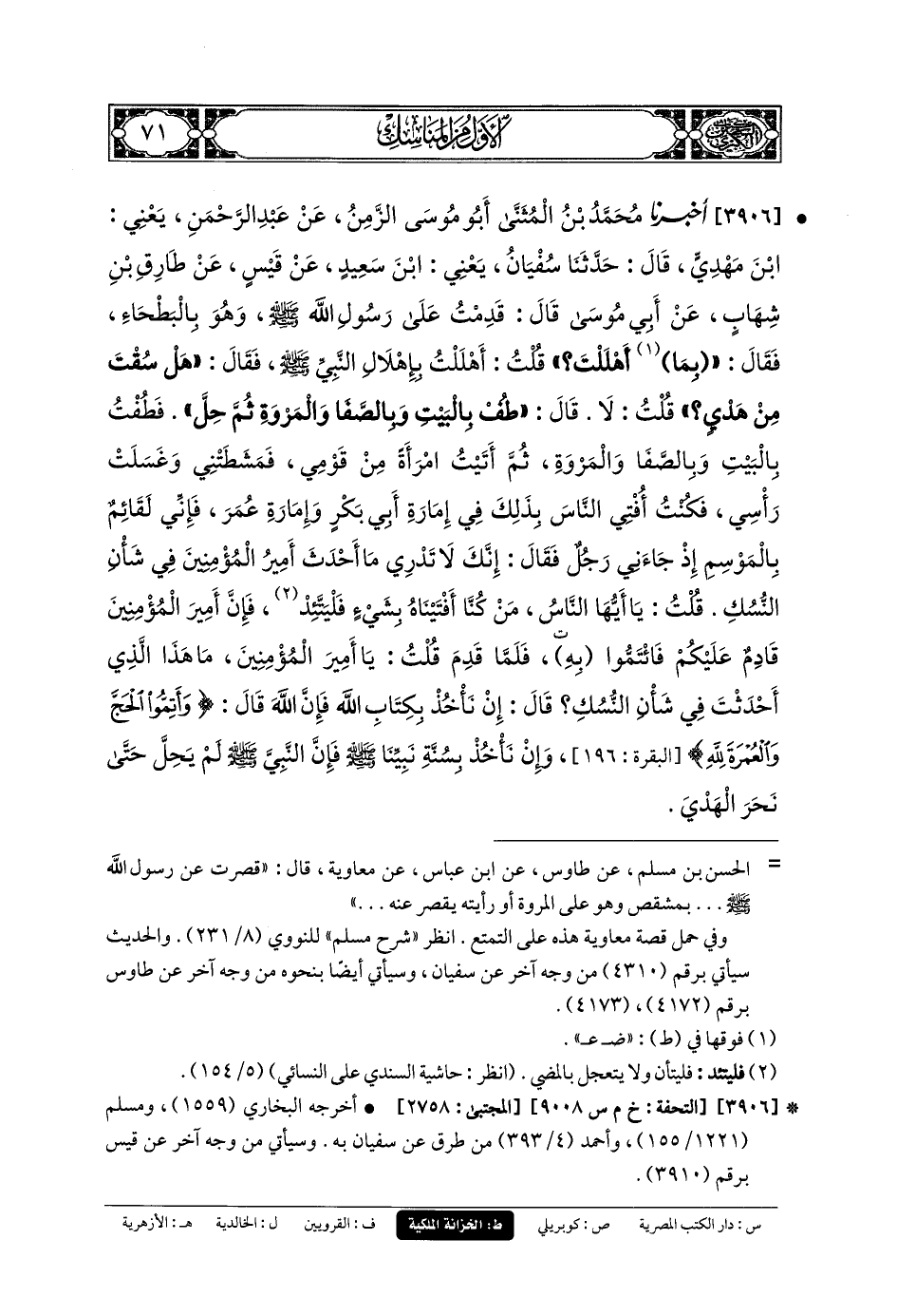 3906 - أَخبَرنا مُحَمدُ بنُ المُثَنَّى أَبو مُوسَى الزَّمِنُ، عَن عَبدِ الرَّحمَنِ، يَعْنِي ابْنَ مَهْدِيٍّ، قَالَ: حَدَّثنا سُفيانُ، يَعْنِي ابْنَ سَعِيدٍ، عَن قَيسٍ، عَن طَارِقِ بنِ شِهَابٍ، عَن أَبي مُوسَى قَالَ: قَدِمْتُ عَلَى رَسُولِ اللهِ صَلى الله عَليه وسَلم وَهُوَ بِالبَطْحَاءِ، فَقَالَ: بِمَ أَهْلَلْتَ؟ قُلْتُ: أَهْلَلْتُ بِإِهْلالِ النَّبيِّ صَلى الله عَليه وسَلم فَقَالَ: هَلْ سُقْتَ مِنْ هَدْيٍ؟ قُلْتُ: لا، قَالَ: طُفْ بِالبَيْتِ وَبِالصَّفَا وَالمَرْوَةِ، ثُمَّ حِلَّ، فَطُفْتُ بِالبَيْتِ وَبِالصَّفَا وَالمَرْوَةِ، ثُمَّ أَتَيْتُ امْرَأَةً مِنْ قَوْمِي فَمَشَطَتْنِي وَغَسَلَتْ رَأْسِي، فَكُنْتُ أُفْتِي النَّاسَ بِذَلِكَ فِي إِمَارَةِ أَبي بَكْرٍ، وَإِمَارَةِ عُمَرَ، فإِنِّي لَقَائِمٌ بِالمَوْسِمِ، إِذْ جَاءَنِي رَجُلٌ، فَقَالَ: إِنَّكَ لا تَدْرِي مَا أَحْدَثَ أَمِيرُ المُؤْمِنِينَ فِي شَأْنِ النُّسُكِ، قُلْتُ: يَا أَيُّهَا النَّاسُ، مَنْ كُنَّا أَفْتَيْنَاهُ بِشَيْءٍ فَلْيَتَّئِدْ، فَإِنَّ أَمِيرَ المُؤْمِنِينَ قَادِمٌ عَلَيْكُمْ فَائْتَمُّوا بِهِ، فَلَمَّا قَدِمَ، قُلْتُ: يَا أَمِيرَ المُؤْمِنِينَ مَا هَذَا الَّذِي أَحْدَثْتَ فِي شَأْنِ النُّسُكِ؟ قَالَ: إِنْ نَأْخُذْ بِكِتَابِ اللهِ، فَإِنَّ اللهَ قَالَ: {وَأَتِمُّوا الحَجَّ وَالعُمْرَةَ لِلَّهِ} وَإِنْ نَأْخُذْ بِسُنَّةِ نَبِيِّنَا صَلى الله عَليه وسَلم، فَإِنَّ النَّبيَّ صَلى الله عَليه وسَلم لَمْ يَحِلَّ حَتَّى نَحَرَ الهَدْيَ.